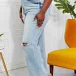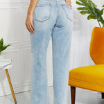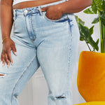 With a high waist, light wash, and distressed detailing, these straight cut jeans will take you right back to the 90's. We love the cat's whiskers fading on the thighs and the raw hem that give these jeans a well-loved look.