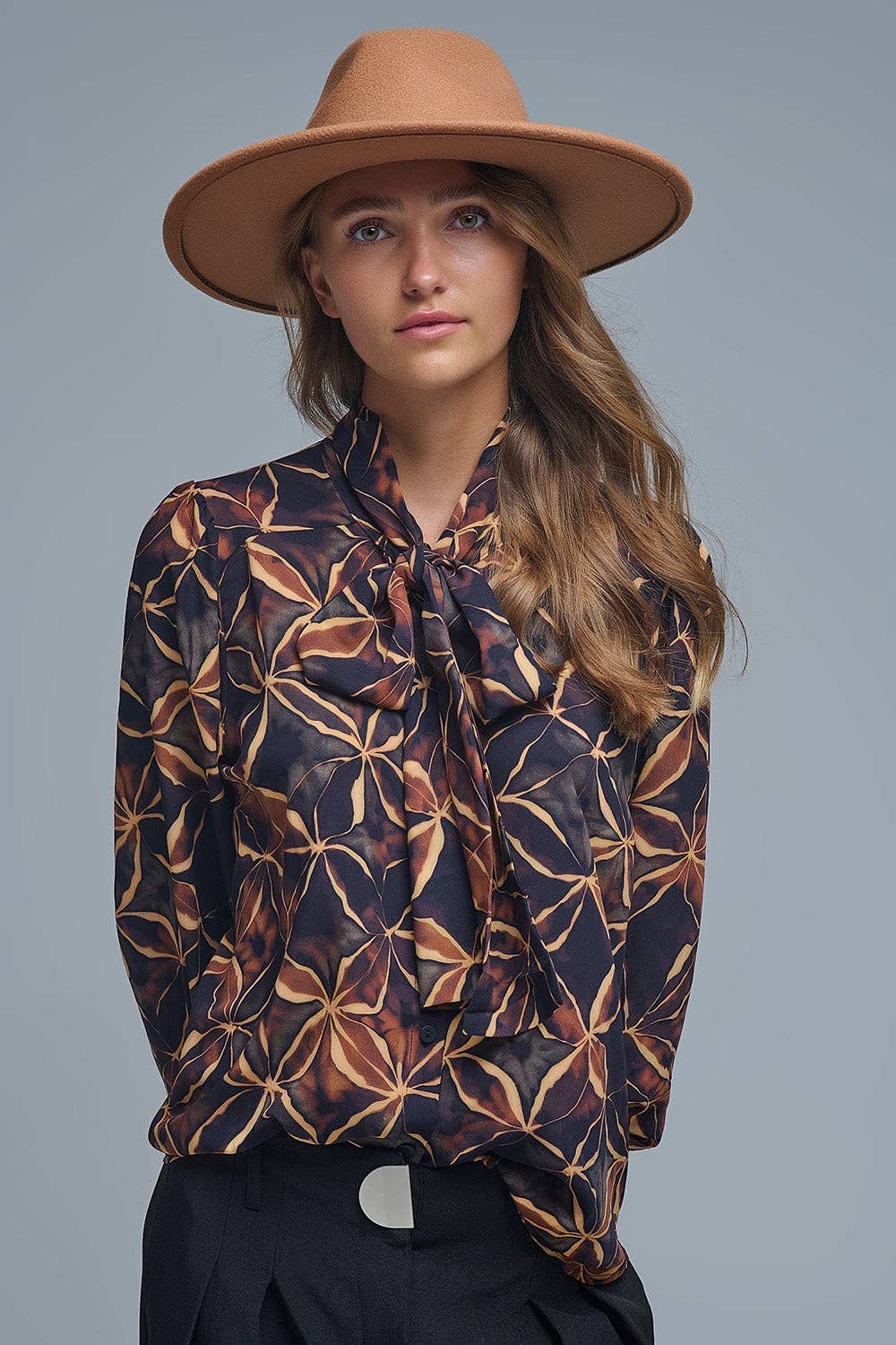 Q2 Black chiffon shirt with abstract print and knotted bow