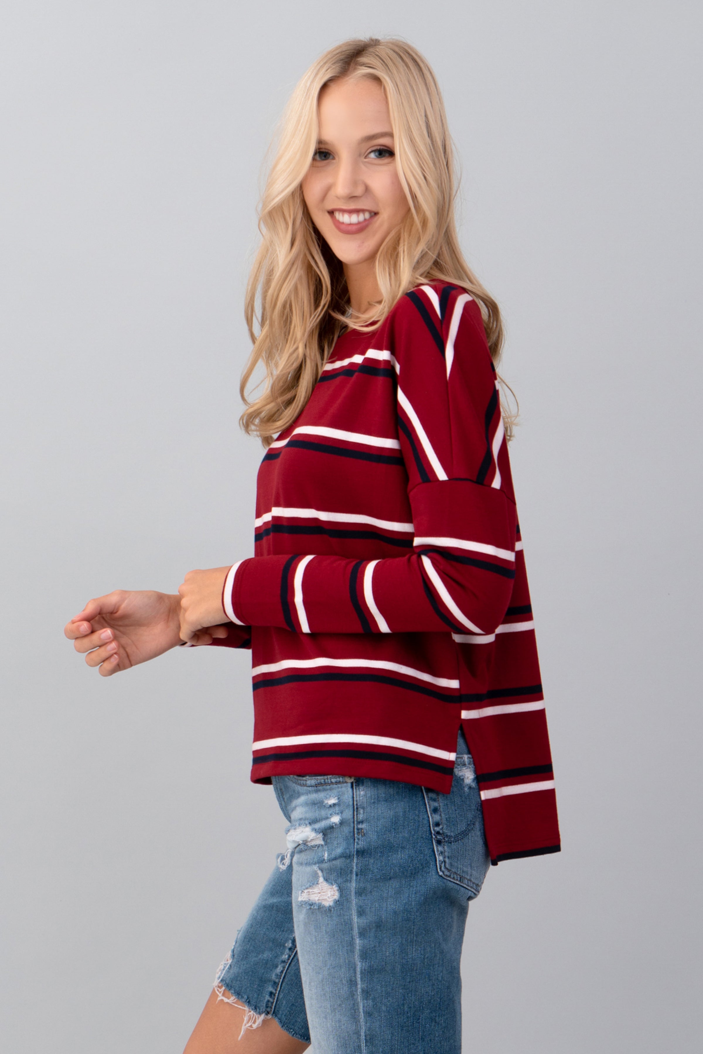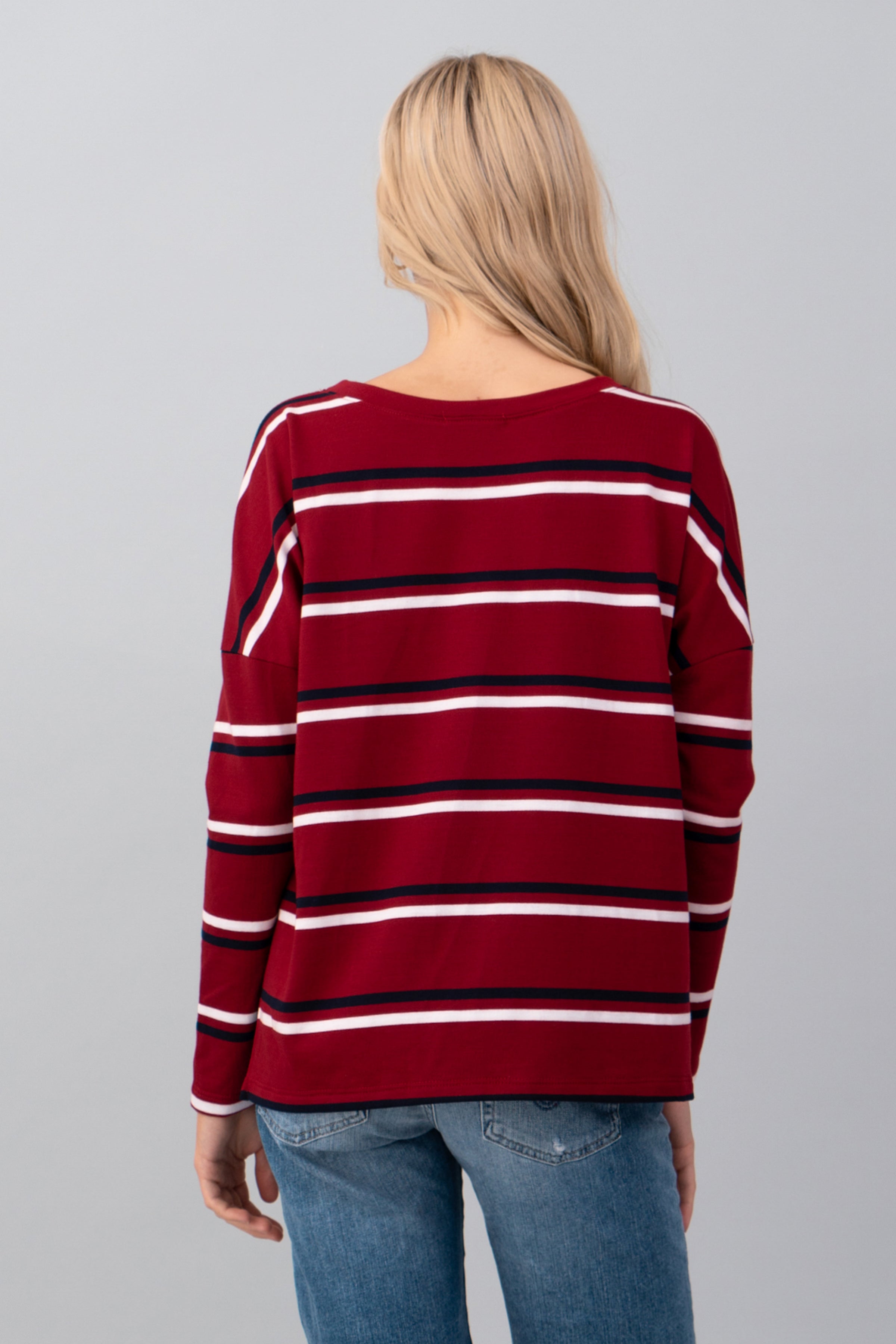 Add effortless cool to your everyday look with this striped drop shoulder top. Featuring a relaxed fit and classic crew neckline, this long sleeve piece offers both comfort and style. The bold horizontal stripes and dropped shoulders create a laid-back, vintage-inspired vibe—perfect for casual days or weekend outings. Style it with denim shorts or jeans for an easy, go-to outfit.