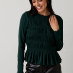 The Round Neck Long Sleeve Smocked Top by Sunday Edition for Le Lis features a fitted bodice with ruffle hem for a feminine finish.