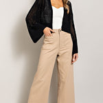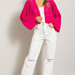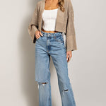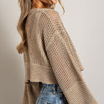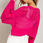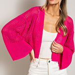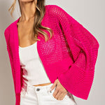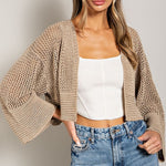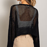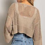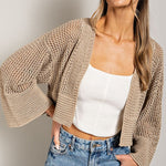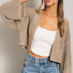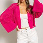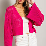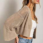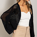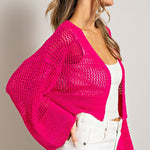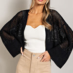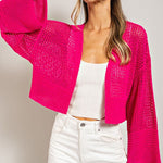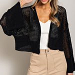 Long sleeve cardigan featuring a cropped length and an all over eyelet knit pattern.