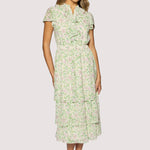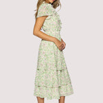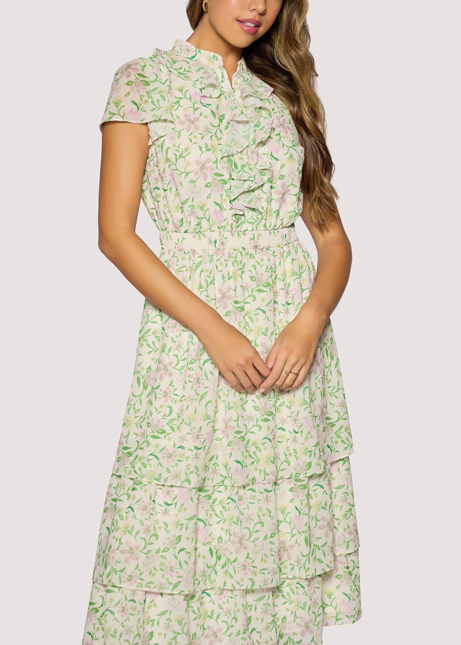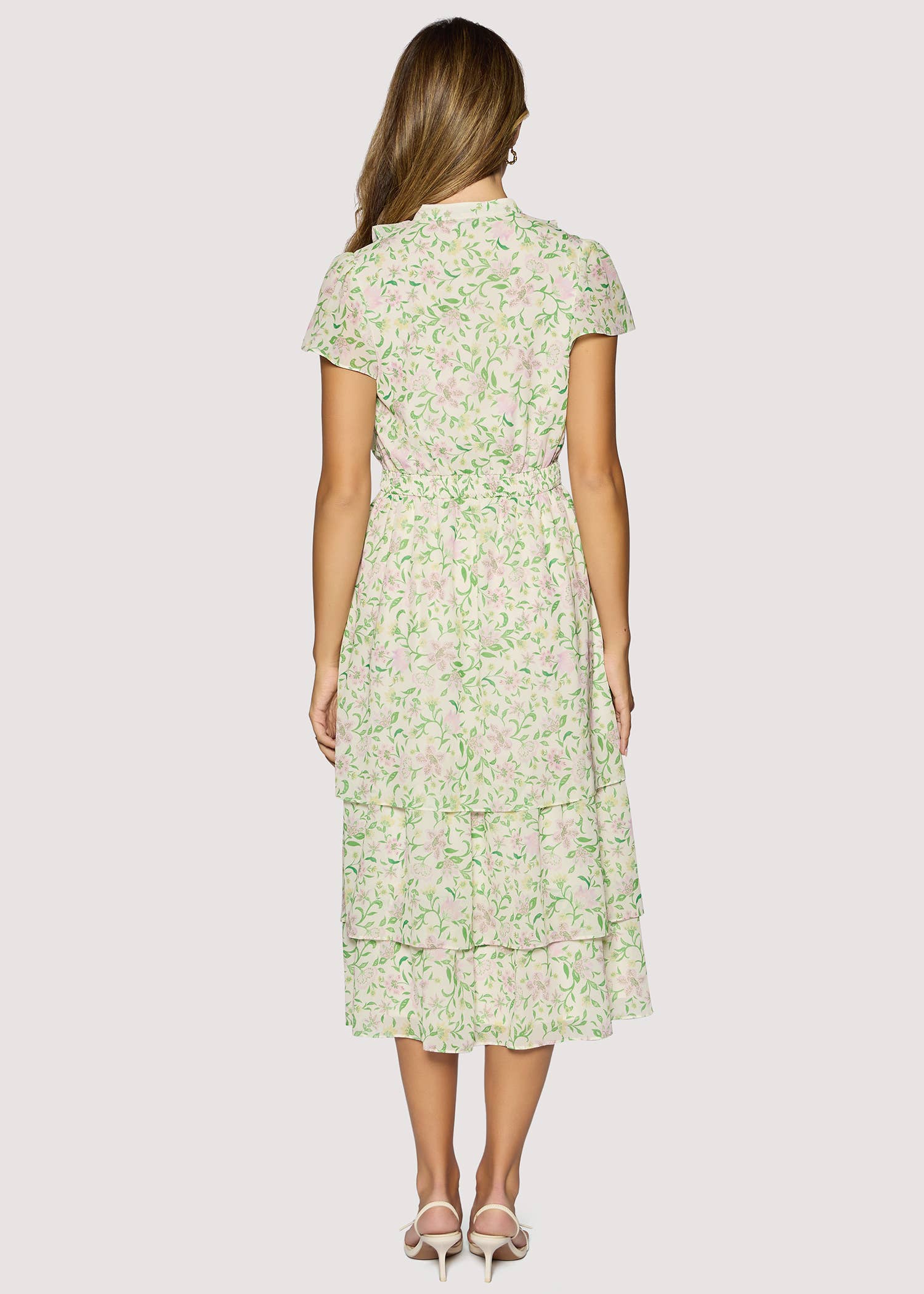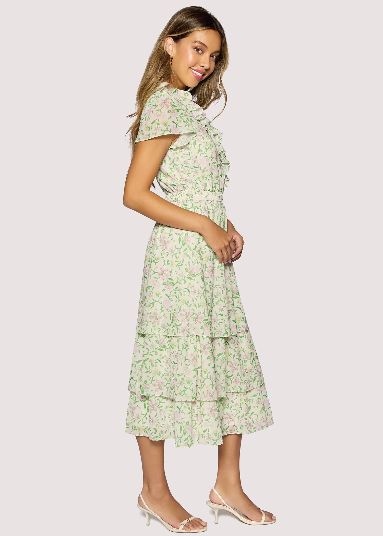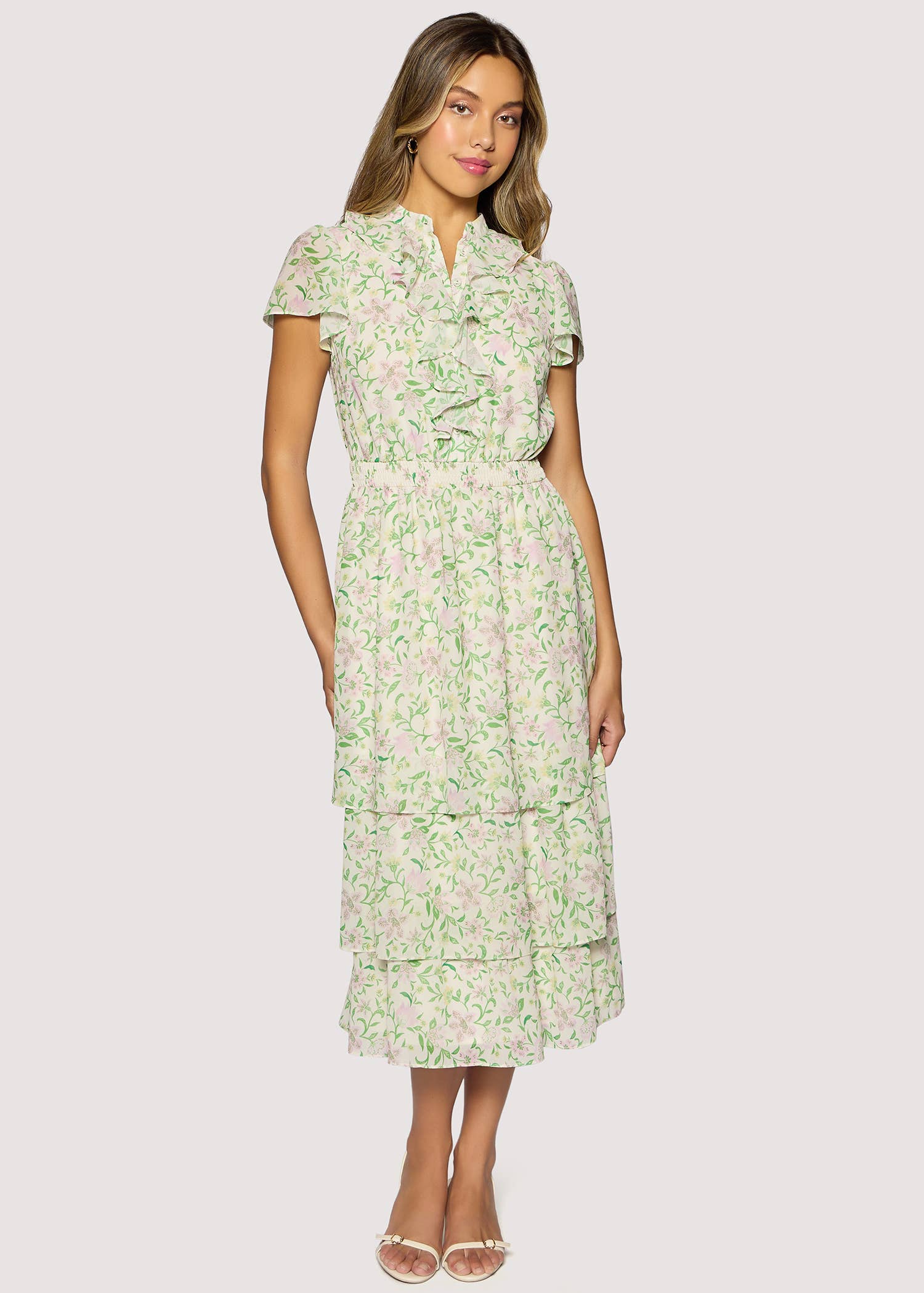 The Wisteria Muse Midi Dress features a vibrant multi-floral print on a flowing midi-length silhouette. Lightweight and airy, it moves gracefully with every step. Perfect for garden parties, brunches, or casual summer days.