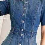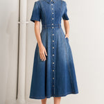 A washed denim midi dress featuring collar, snap button down, short sleeve and circle skirt