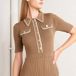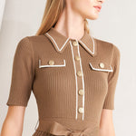 A ribbed sweater knit midi dress featuring collar, front button down and self sash tie