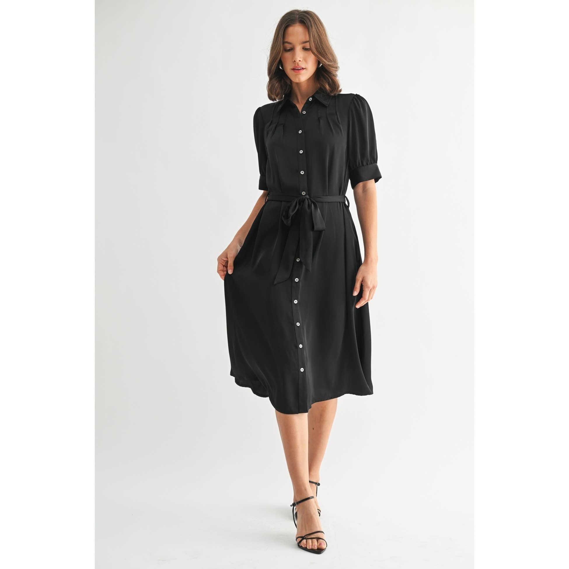 FUN2FUN - SATIN PLEATS DETAIL TIE WAIST SHIRT DRESS