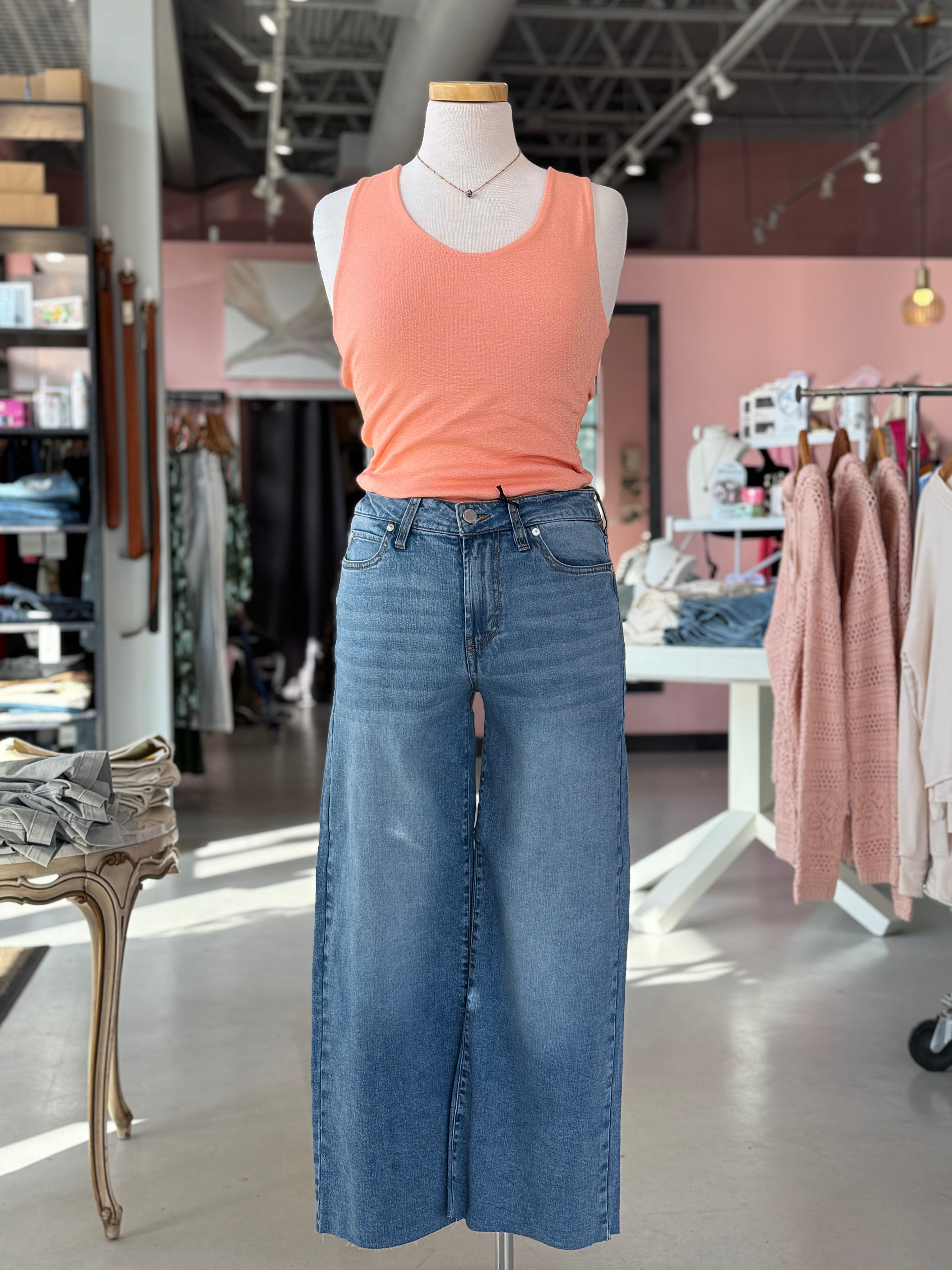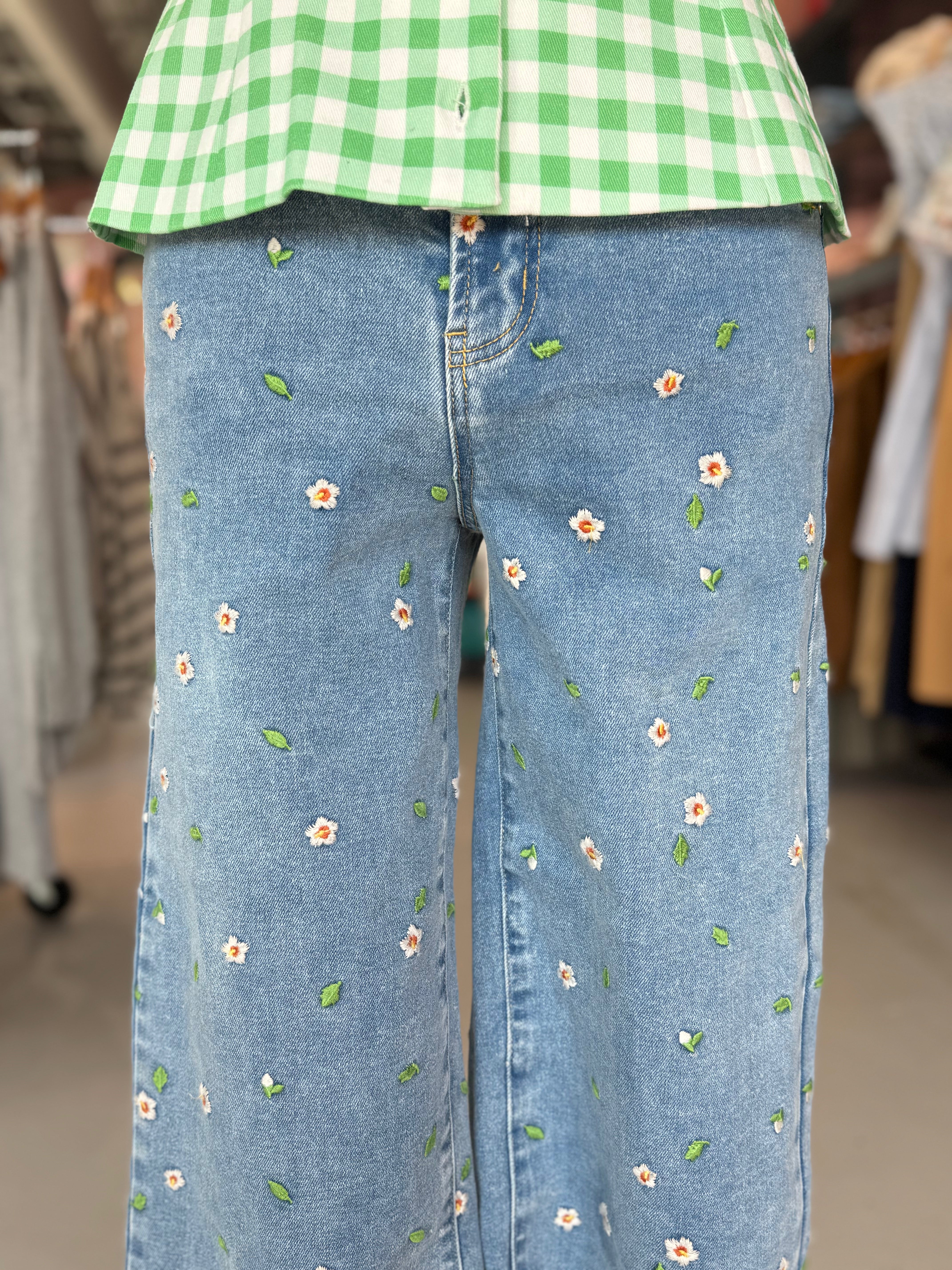 Wide Leg Crop Jeans with Hibiscus Embroidery, by OAT