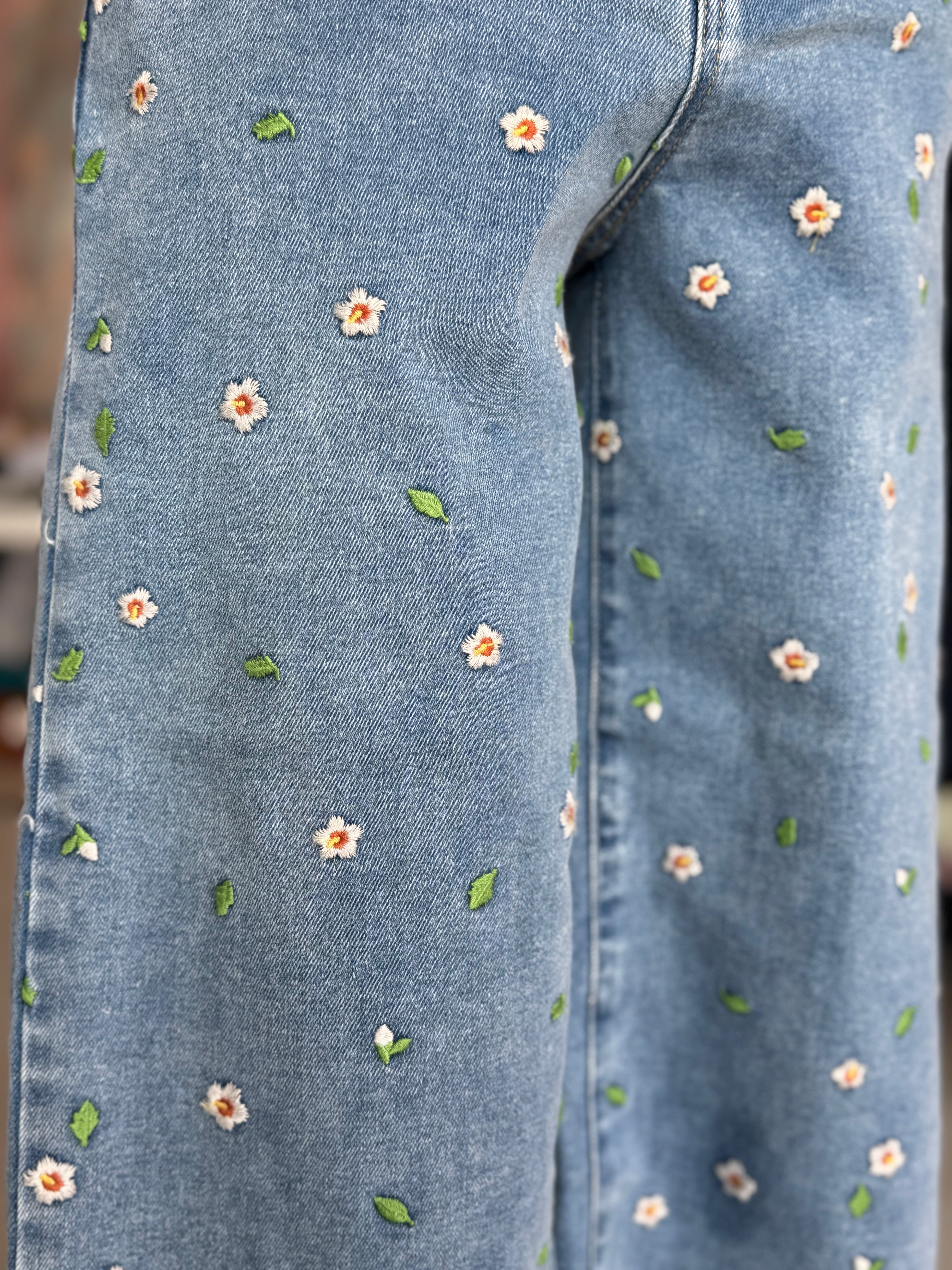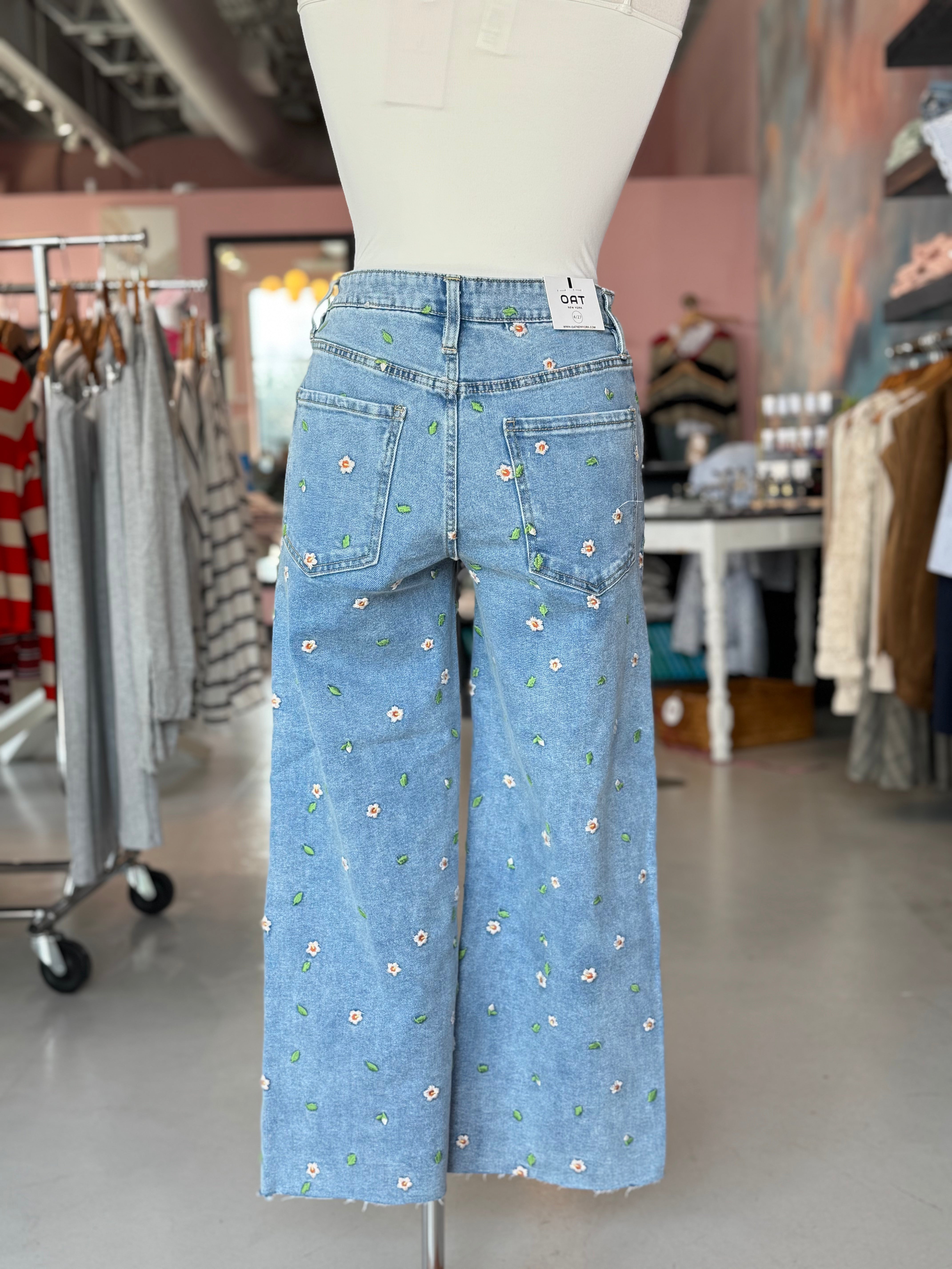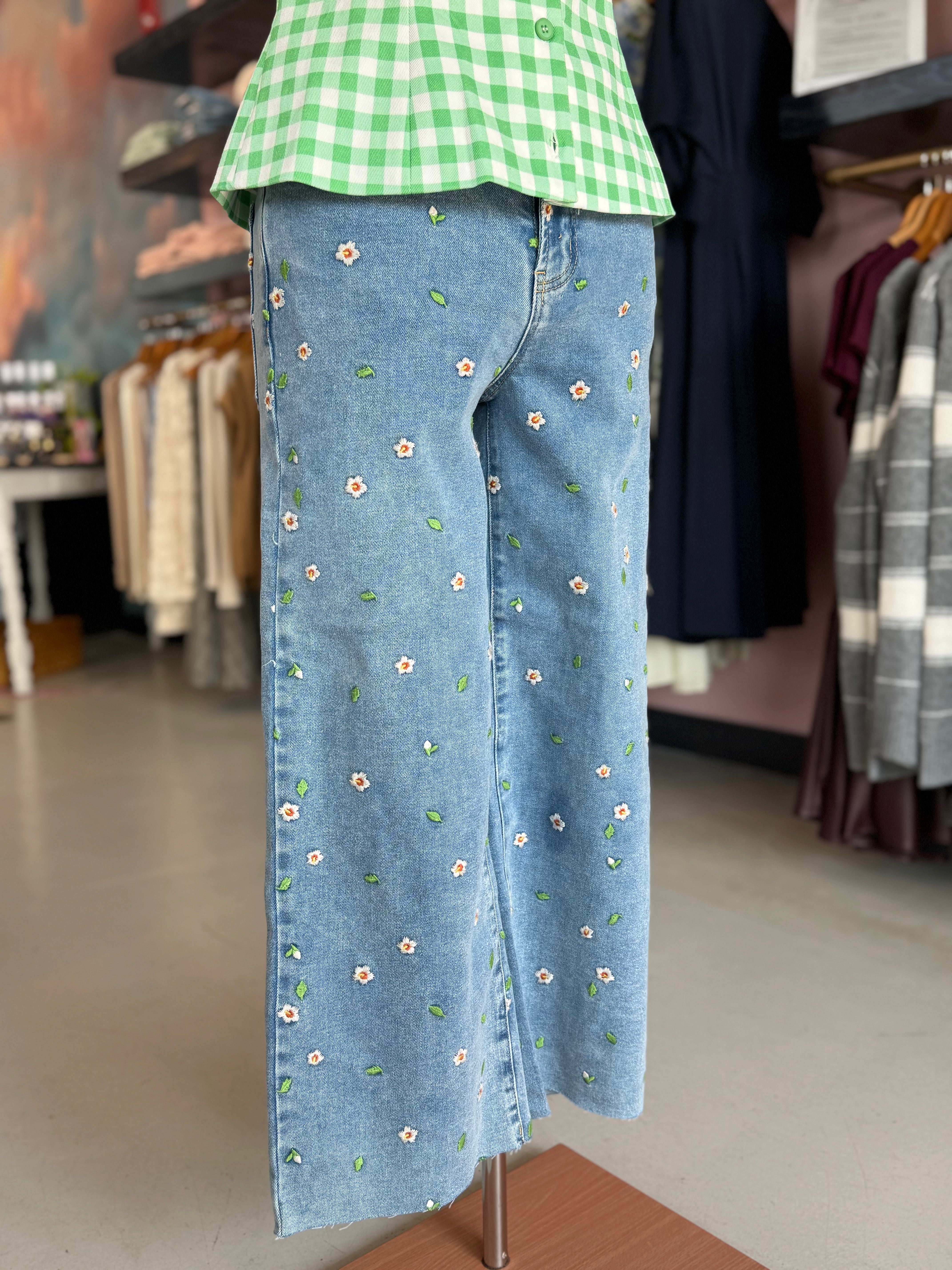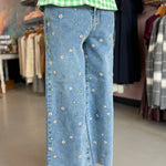 Wide Leg Crop Jeans with Hibiscus Embroidery, by OAT
