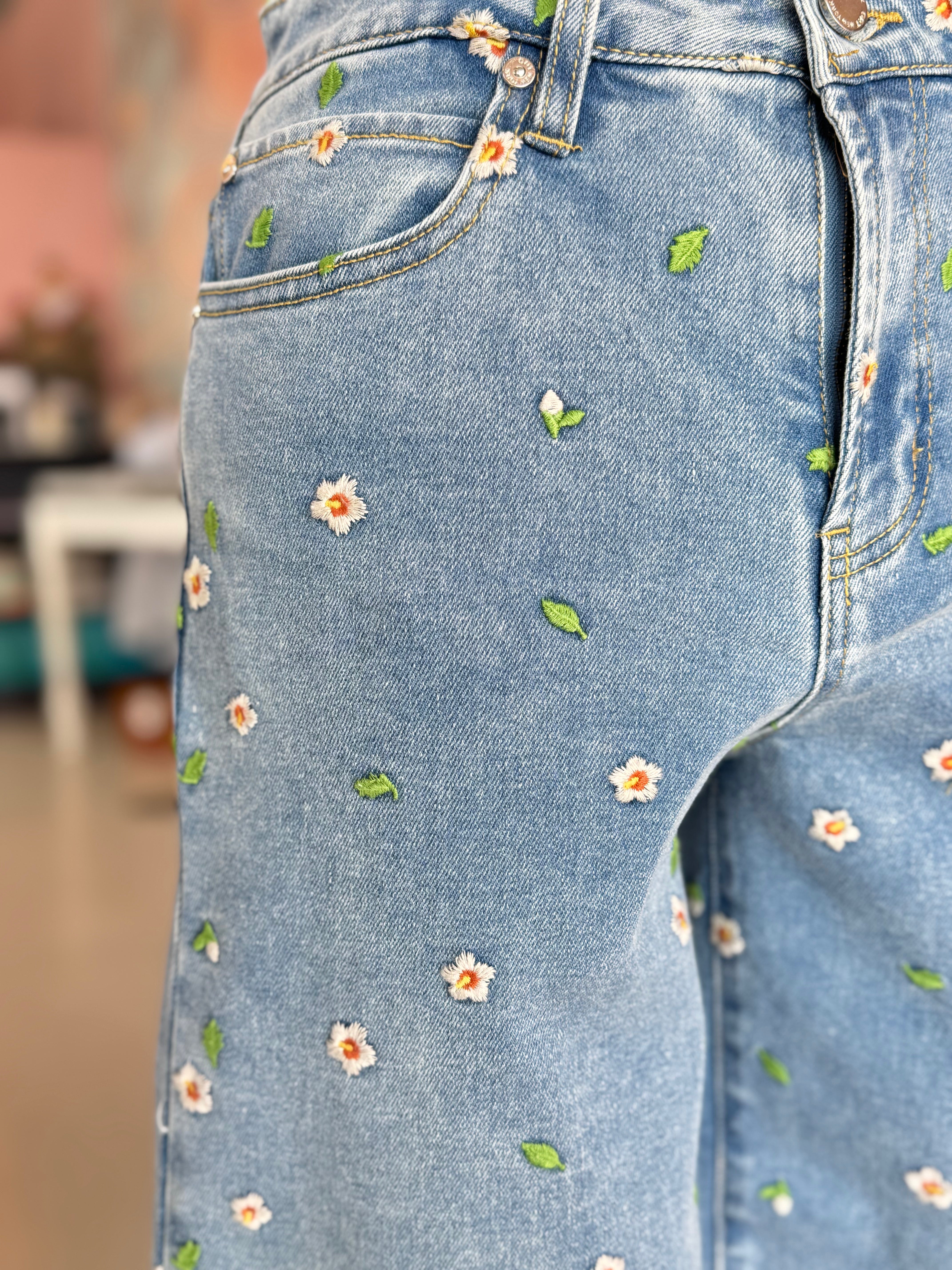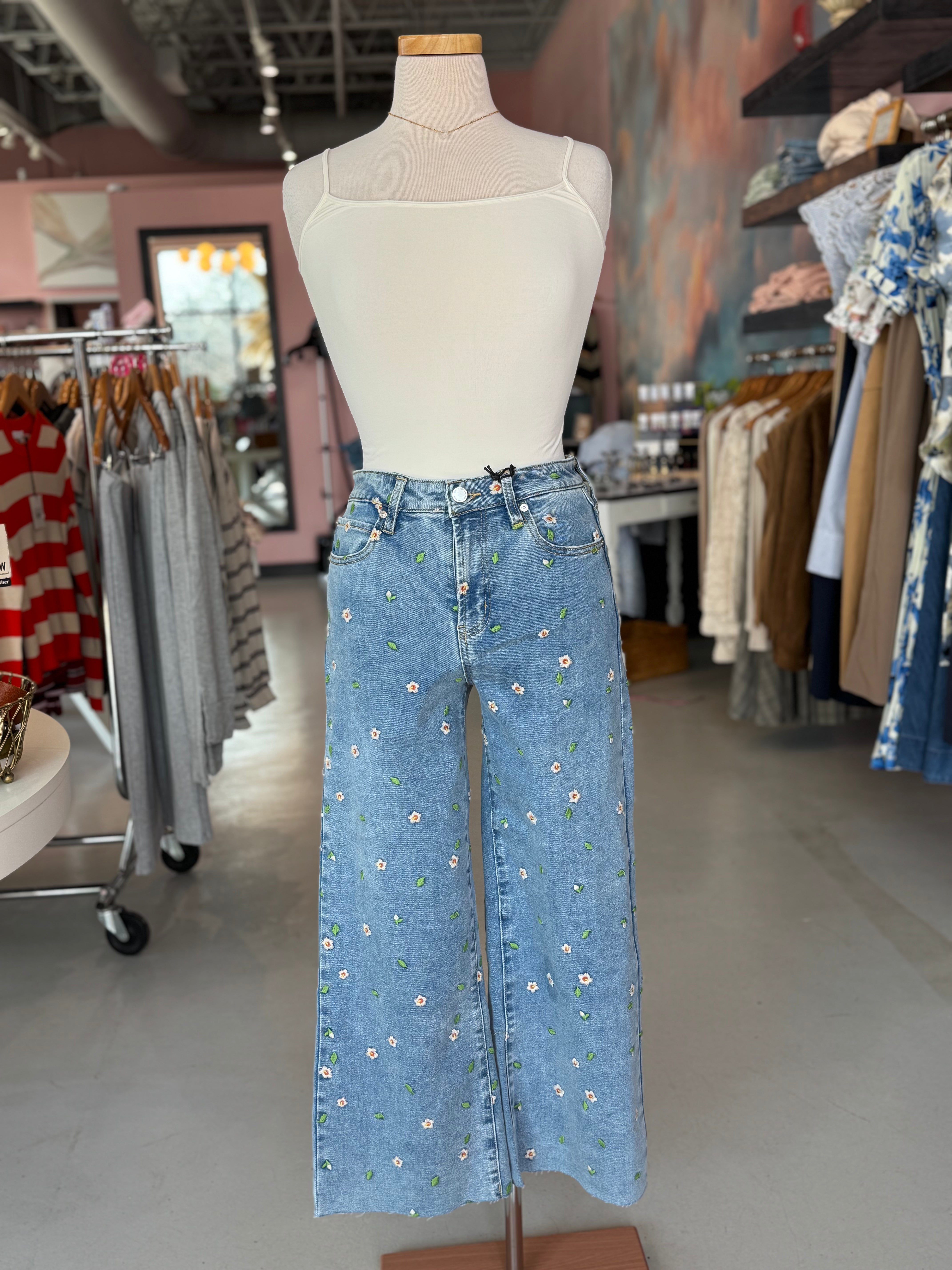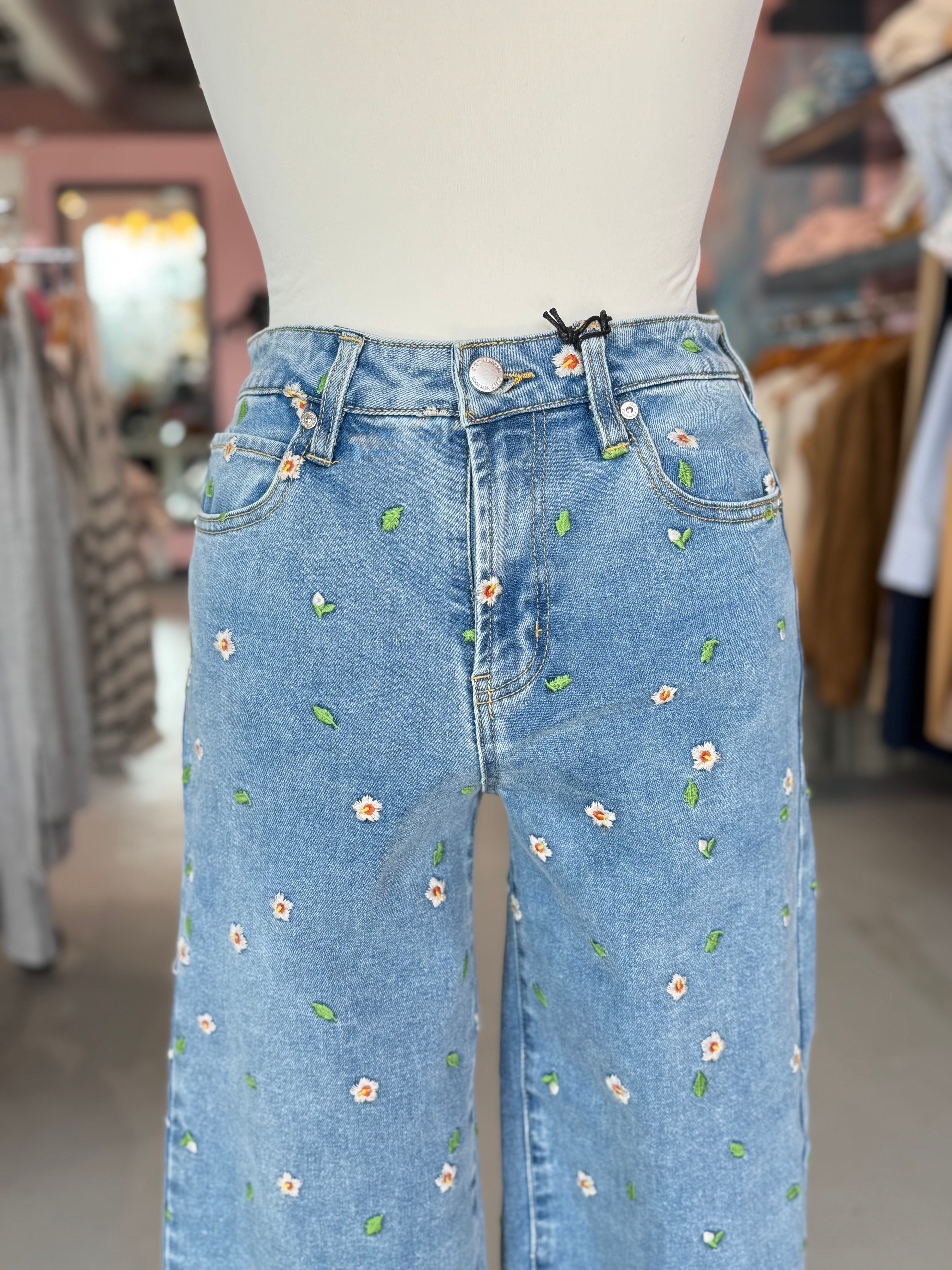 Wide Leg Crop Jeans with Hibiscus Embroidery, by OAT