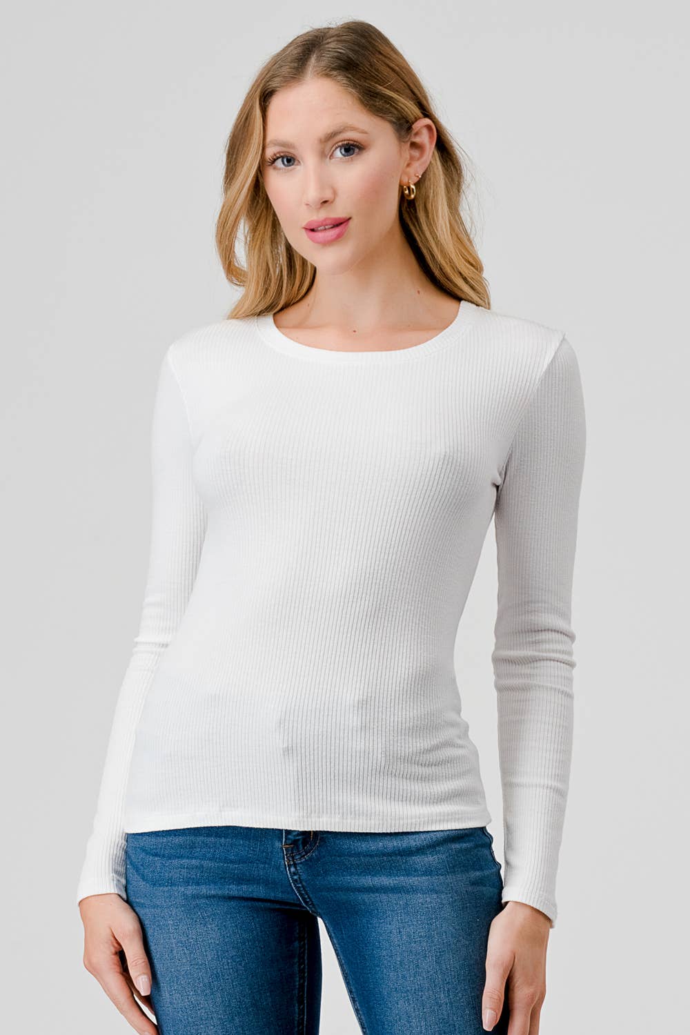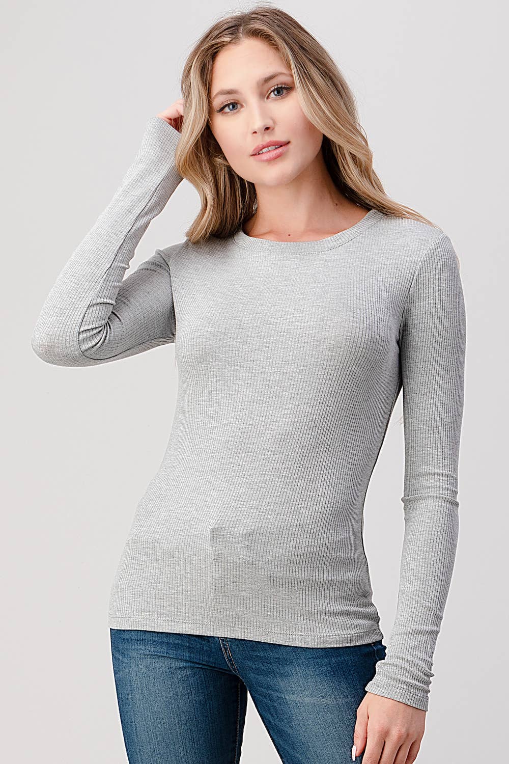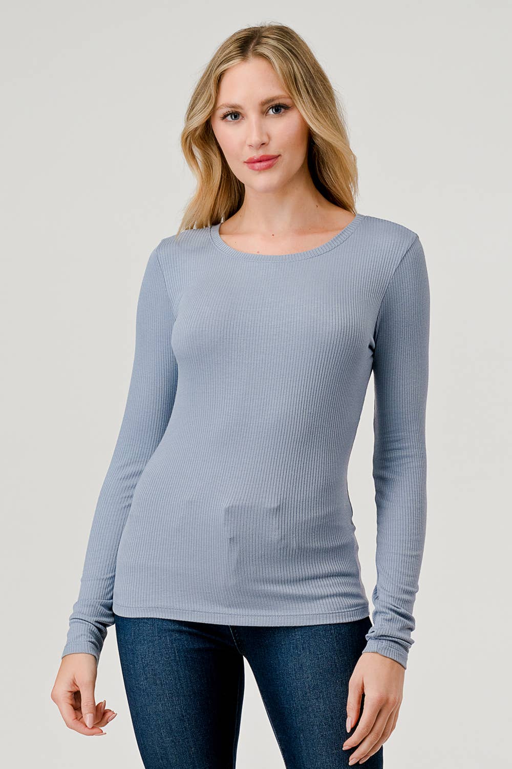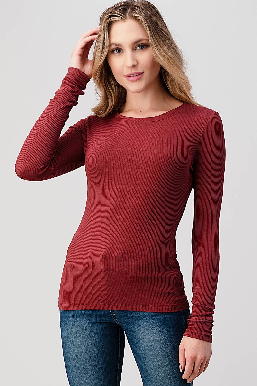 A timeless long sleeve top with a round neckline and soft ribbed texture. Made with a comfortable, stretchy rayon blend.