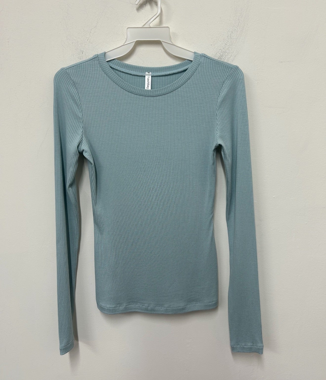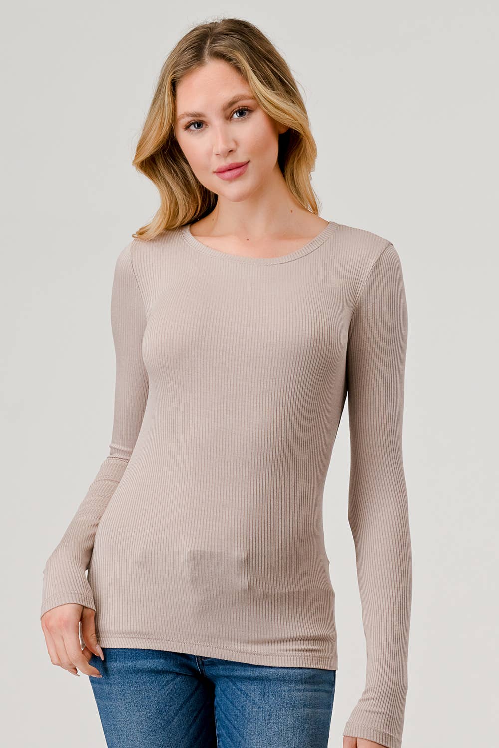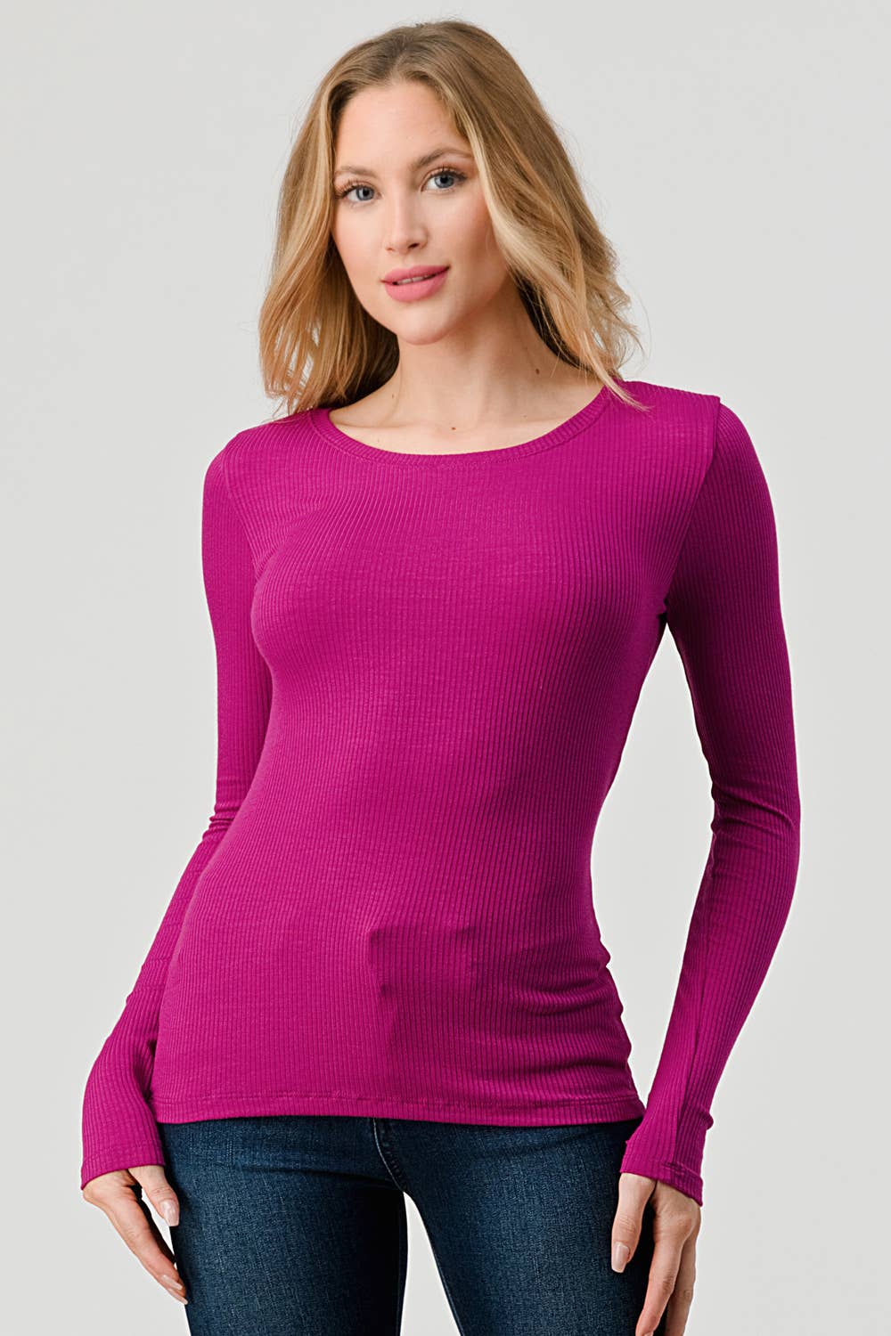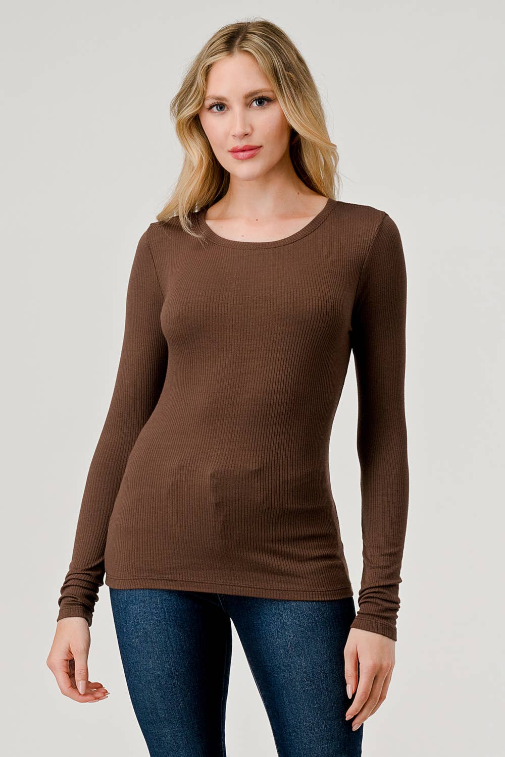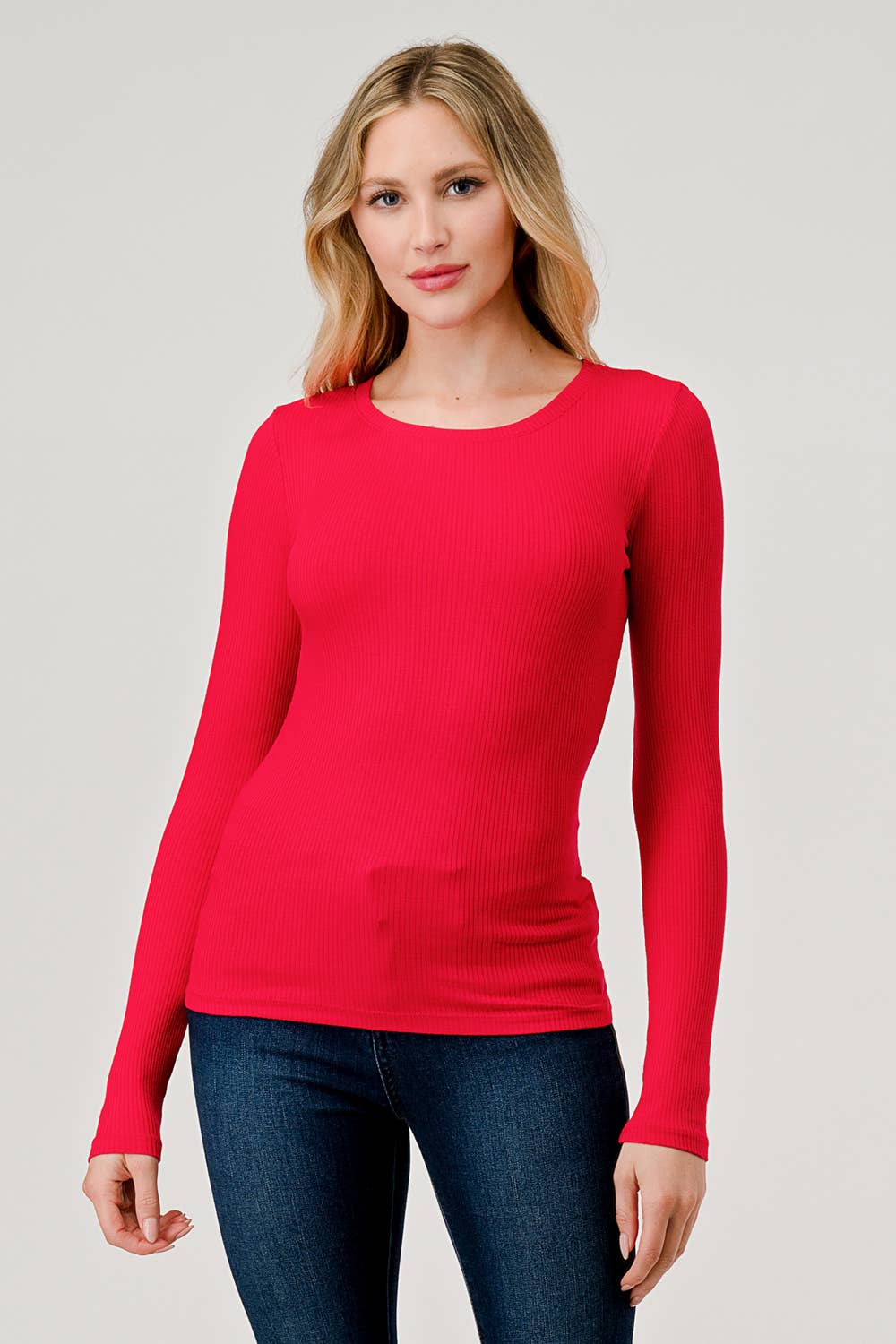 A timeless long sleeve top with a round neckline and soft ribbed texture. Made with a comfortable, stretchy rayon blend.