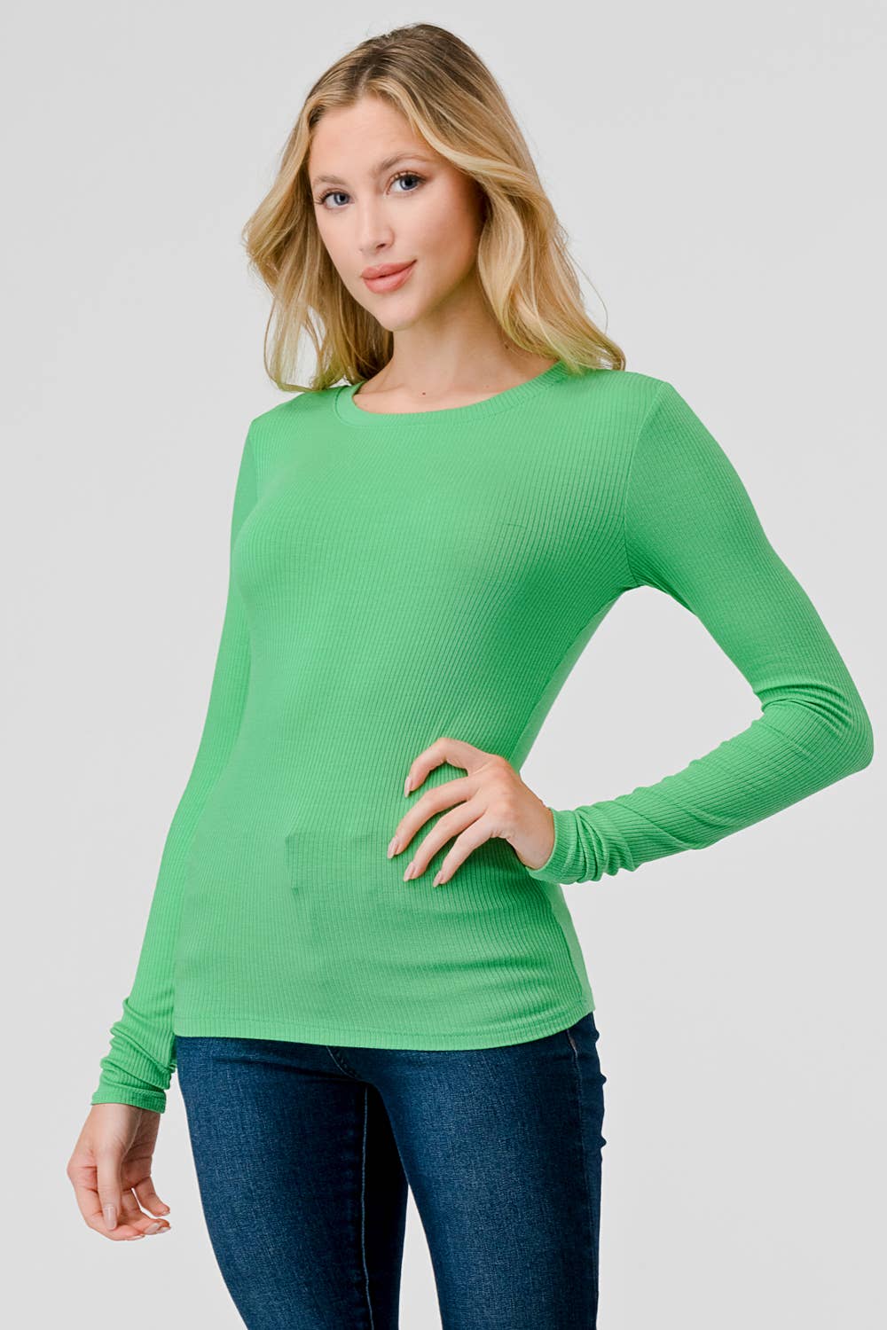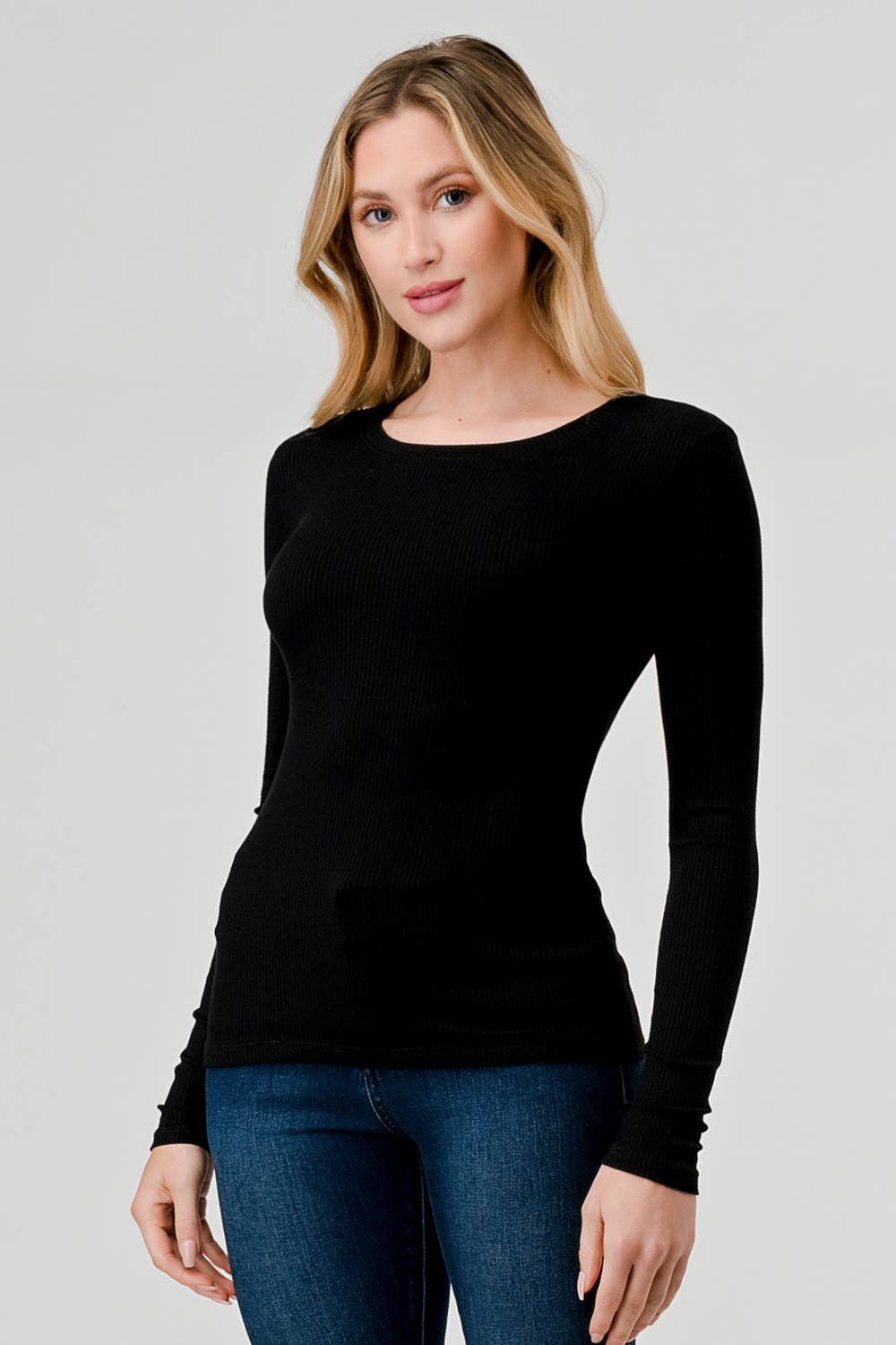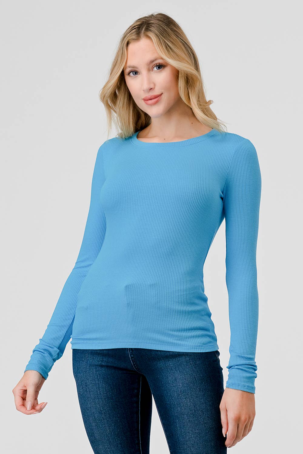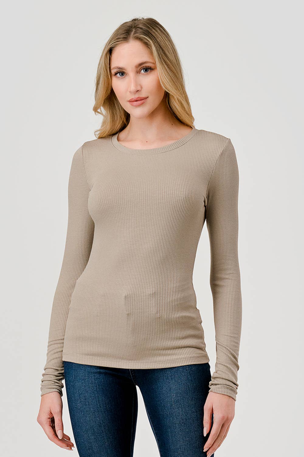 A timeless long sleeve top with a round neckline and soft ribbed texture. Made with a comfortable, stretchy rayon blend.