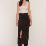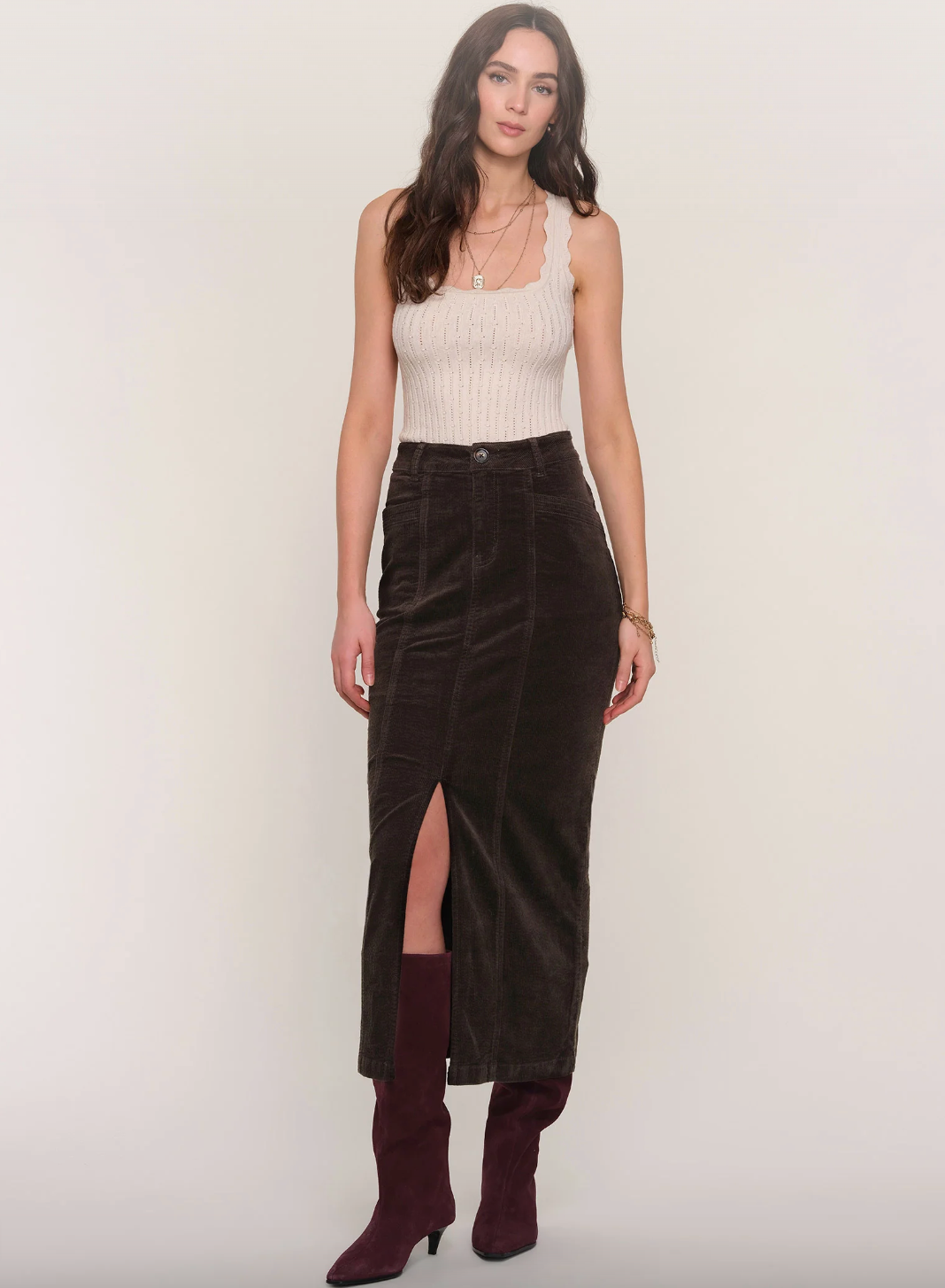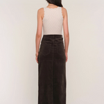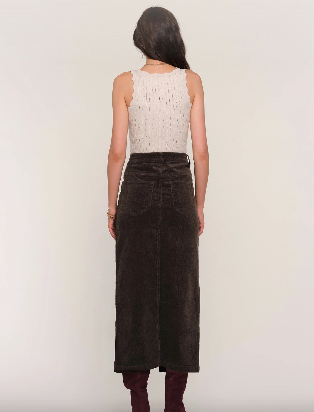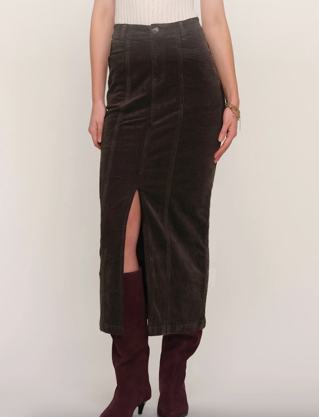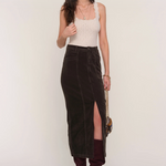 The Zanima Skirt is made from a soft, washed corduroy. It is midi length, hitting at mid calf. It features a slim fit, front slit, and slant pockets.