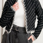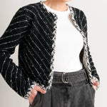 A sweater knit cropped jacket featuring round neckline, contrasting edge and front hook & eye closure