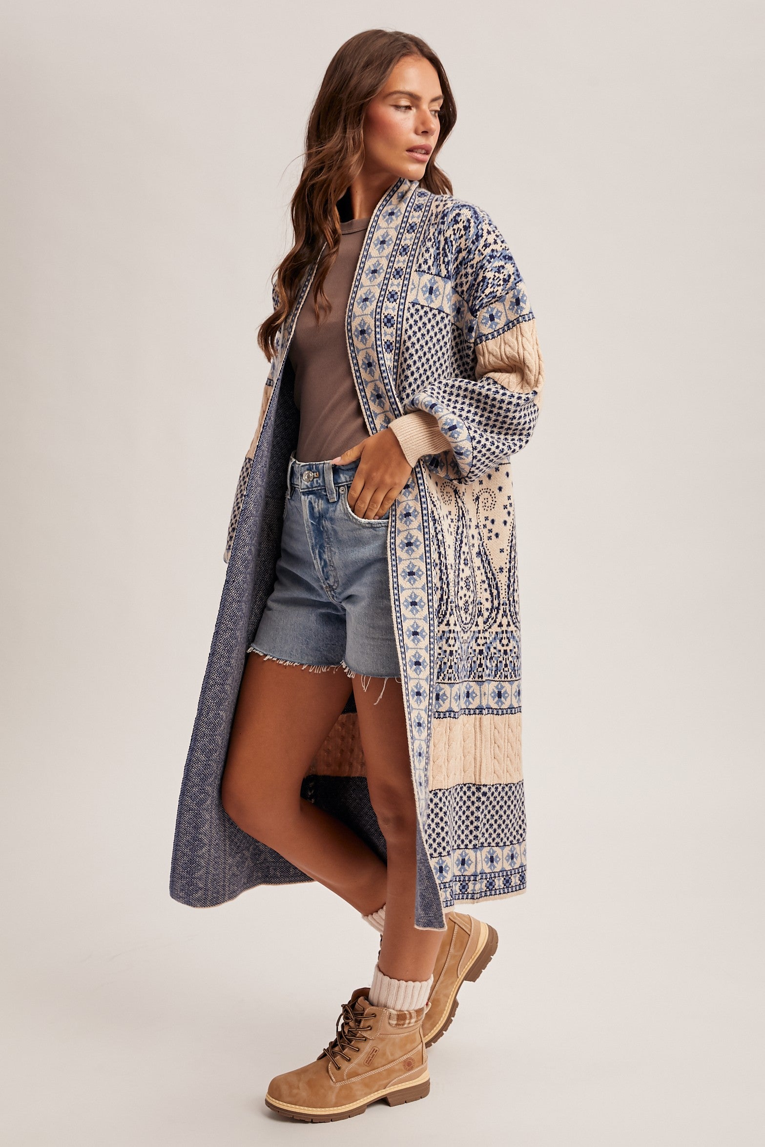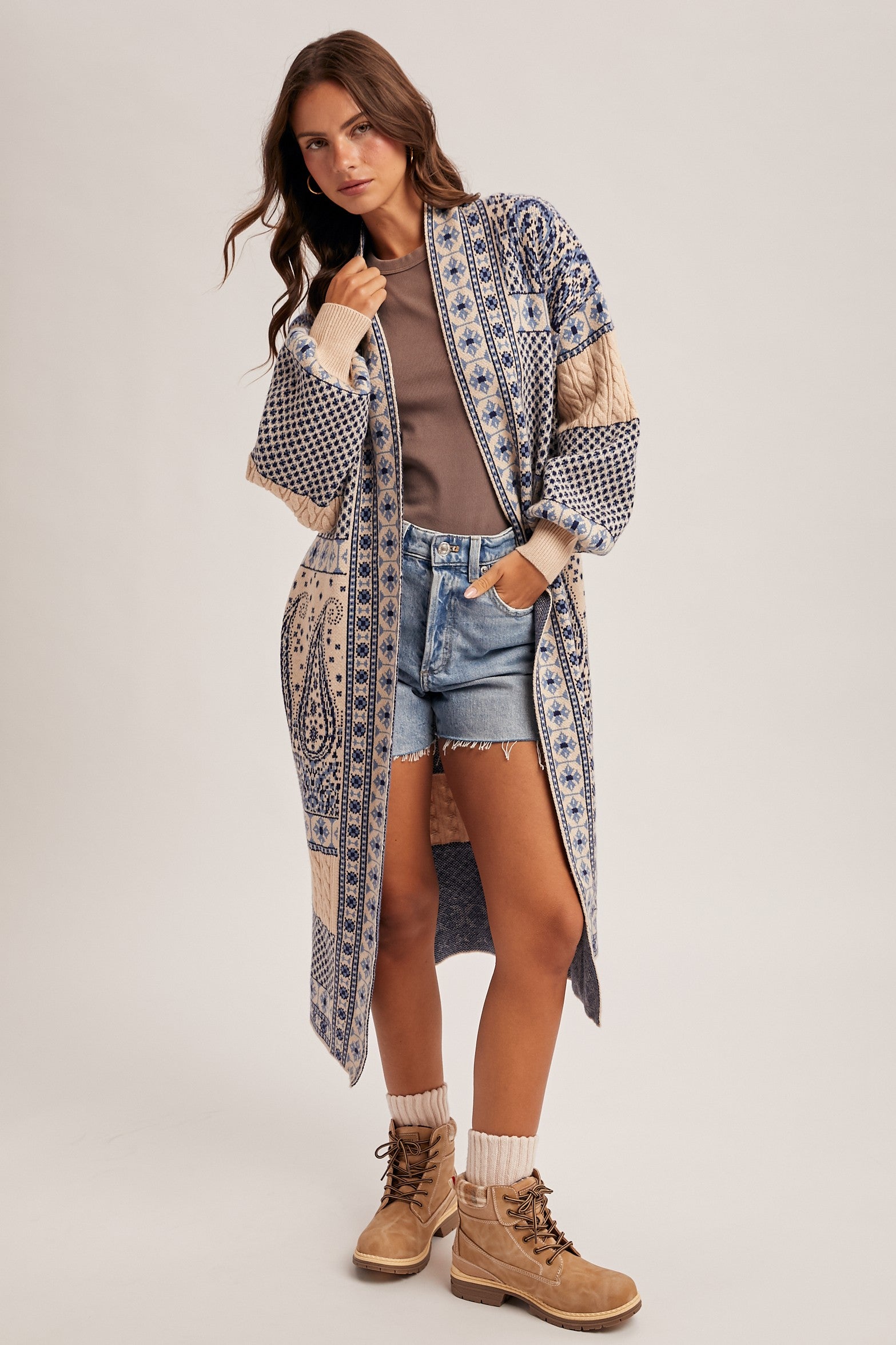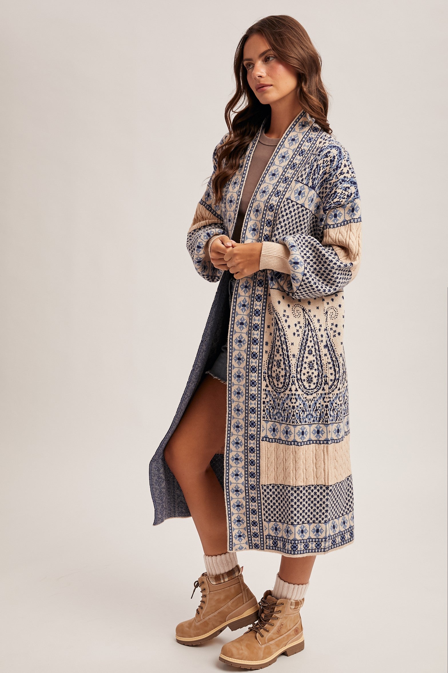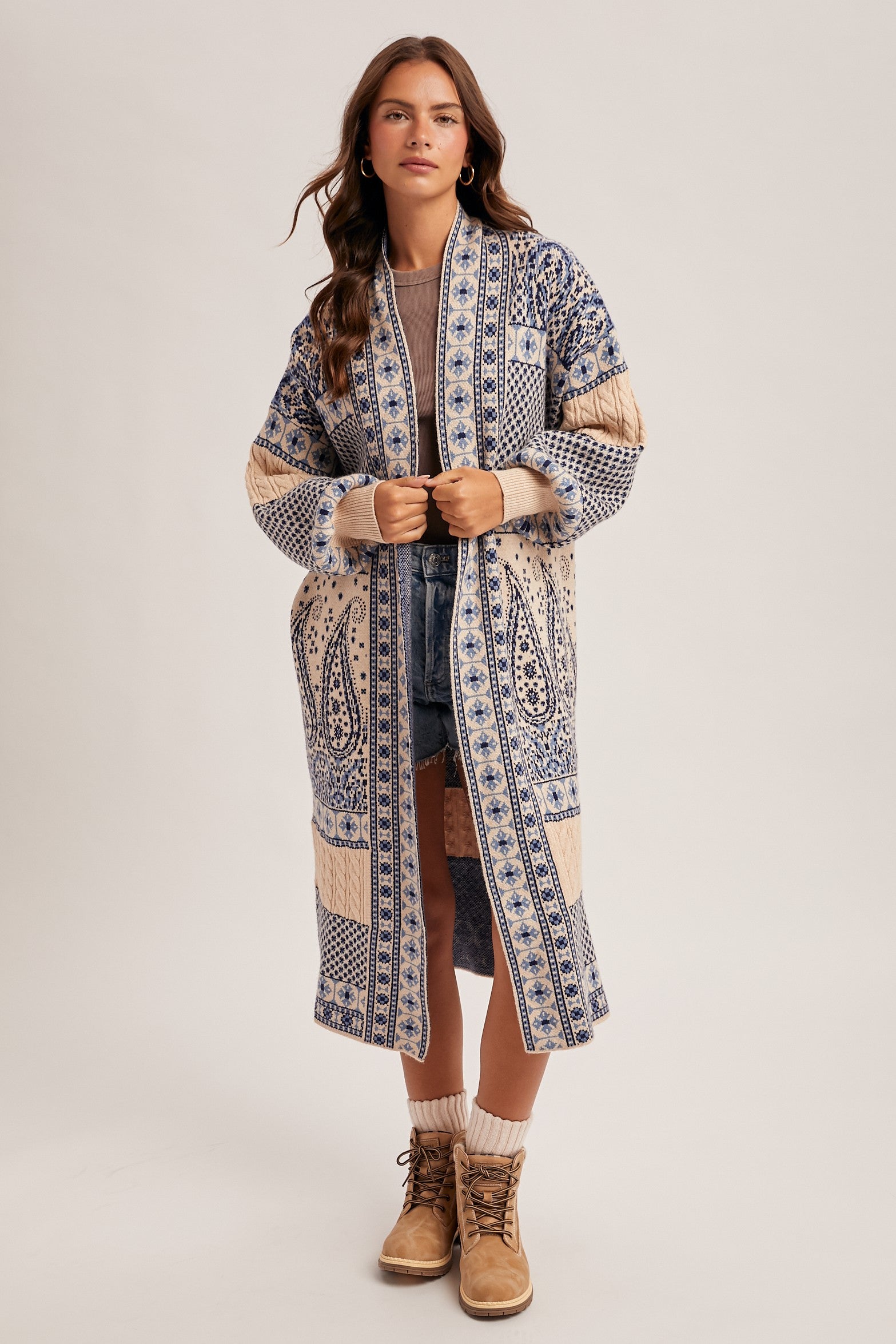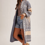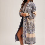 Cozy and stylish, this paisley sweater coatigan features soft knit fabric and a longline design. Perfect for layering over casual or dressy outfits, it adds warmth and effortless style to any wardrobe.