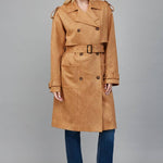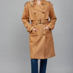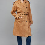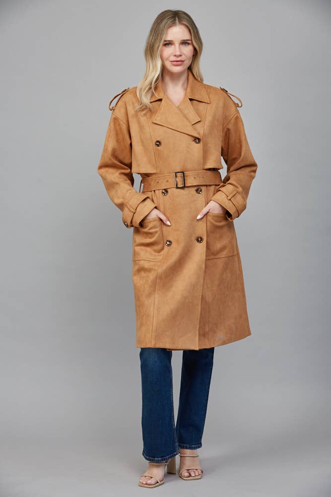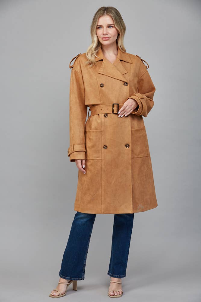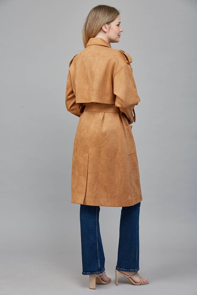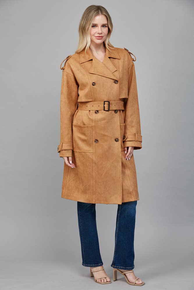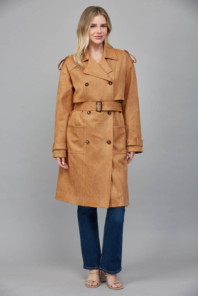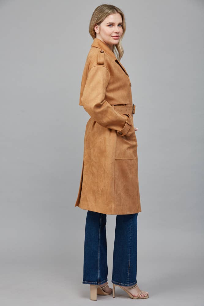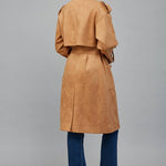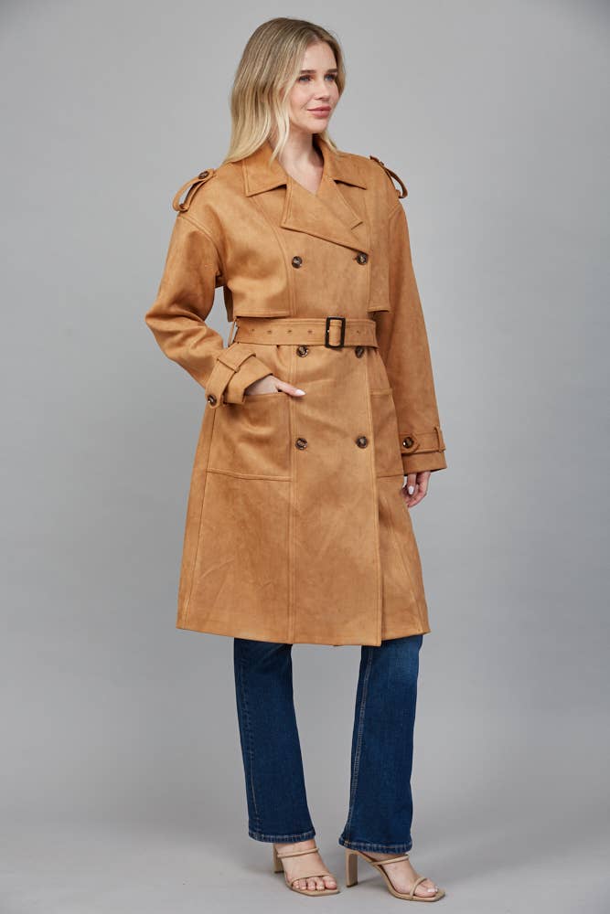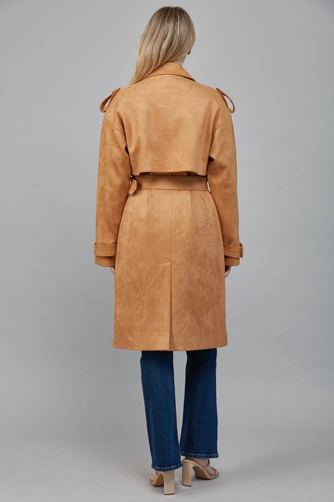 faux suede double breasted trench coat. This double-breasted trench delivers clean structure, smooth texture, and a refined look. It's perfect for everyday layering.