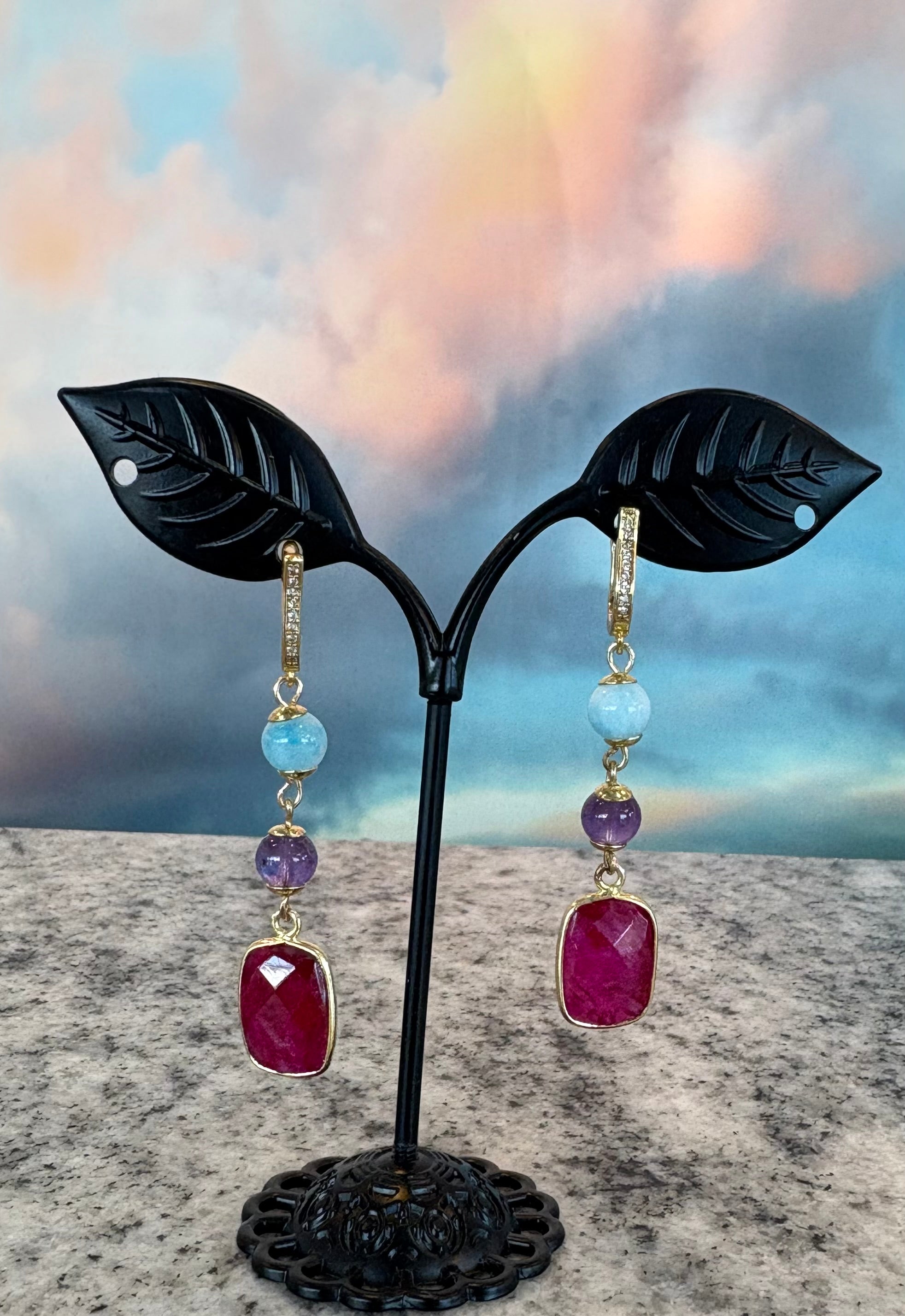 A drop earring  with French leaver back clasp, and faceted square Ruby with Amethyst and  Larimar bead.