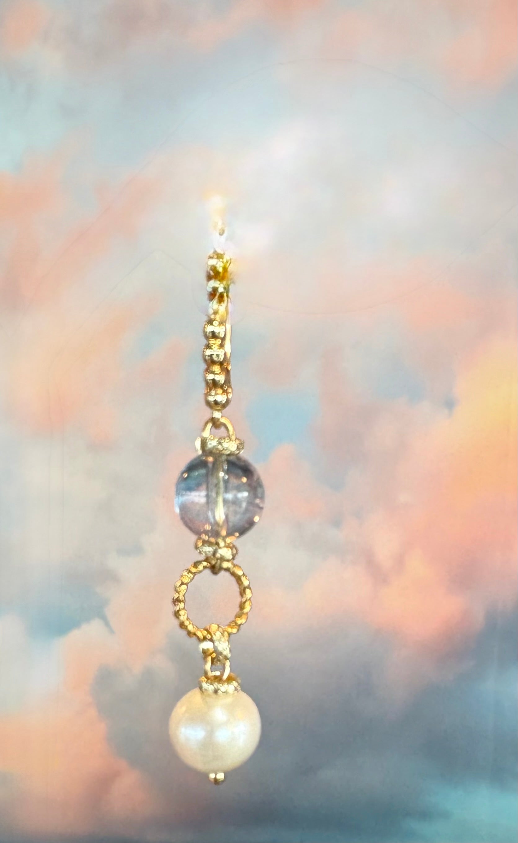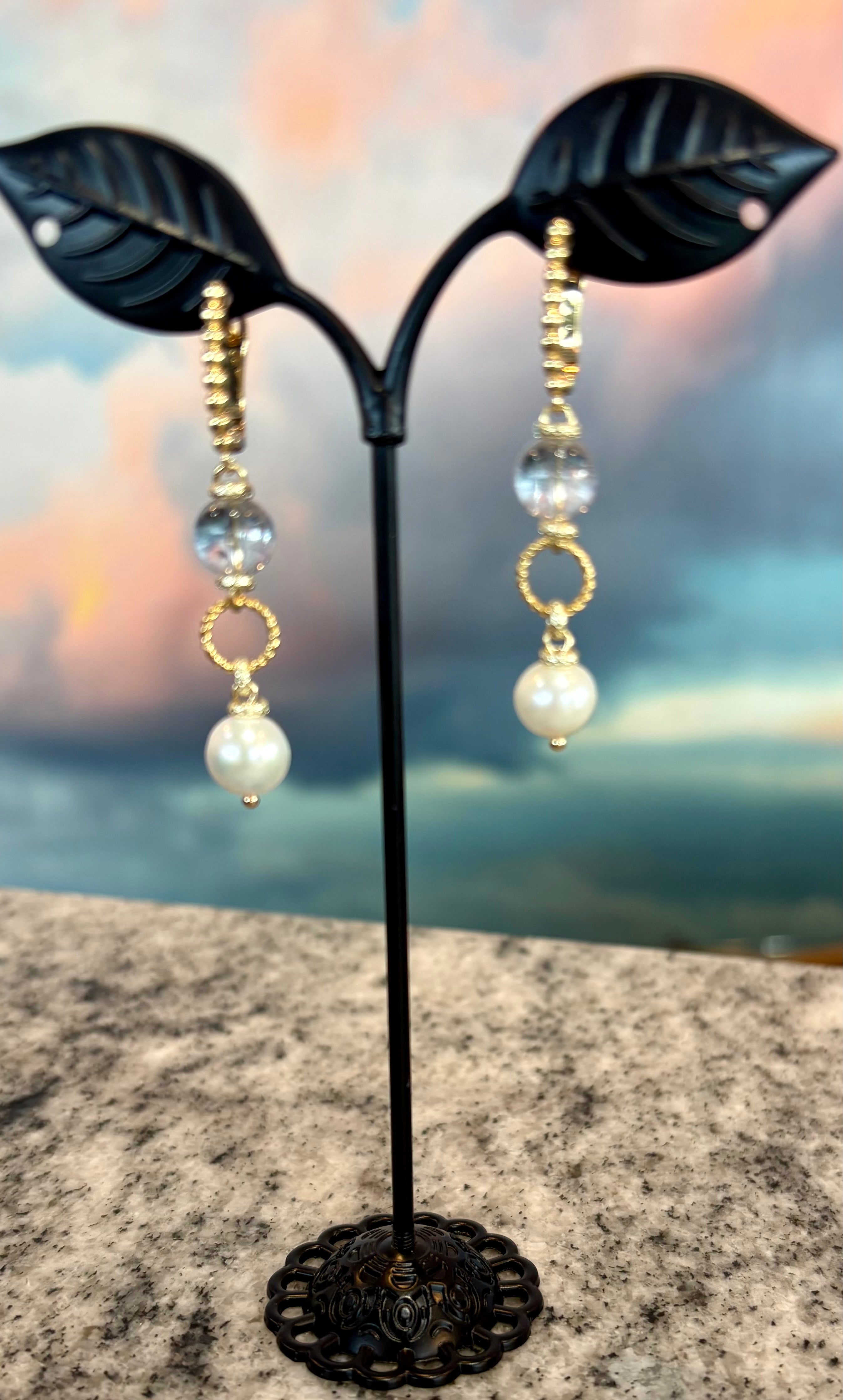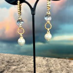 Handmade, Blue topaz bead with circle link and Pearl, drop earrings. Lightweight, eye-catching, and nature-inspired touch to any outfit.