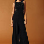 A velvet jumpsuit featuring wide neckline, sleeveless, wide leg and back zipper closure