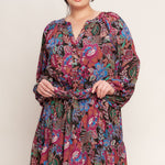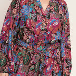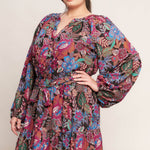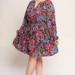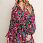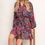 A printed woven mini dress featuring round neckline, button down bodice, long sleeve, elasticized waist with self sash tie and ruffled hemline