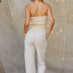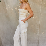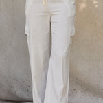 65% Cotton 35% Linen - Easy wear pants - Stripe pattern - Straight leg style - Elasticized waistband with drawstring - Side patch pockets - Side pockets - Not lined - Model is wearing size small - Imported