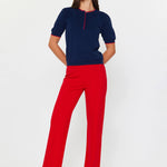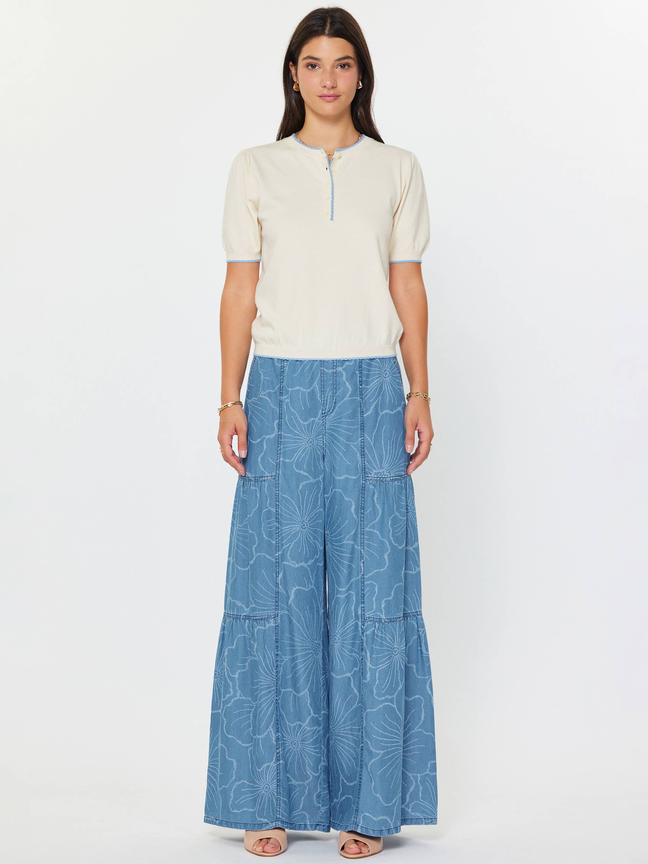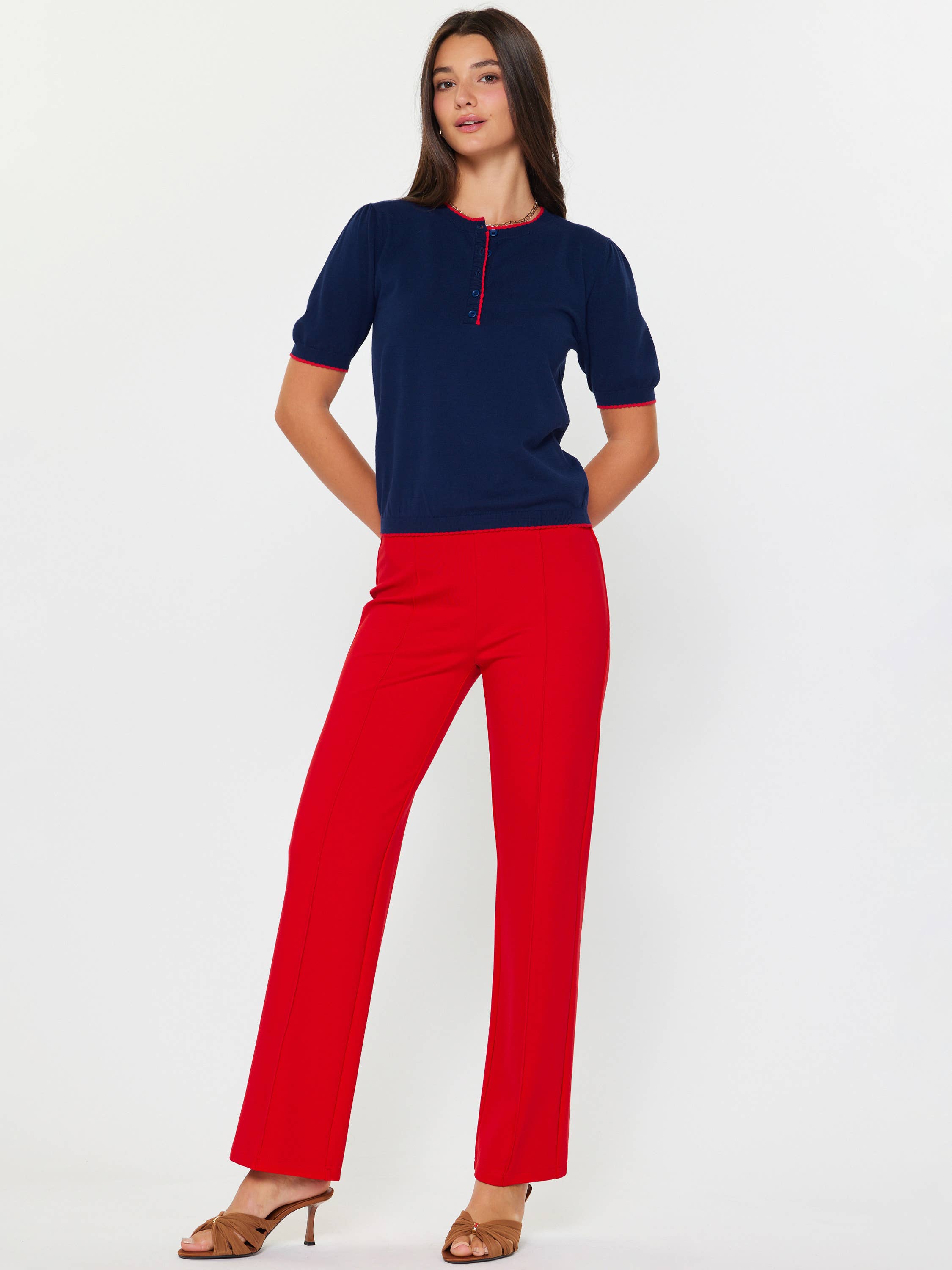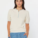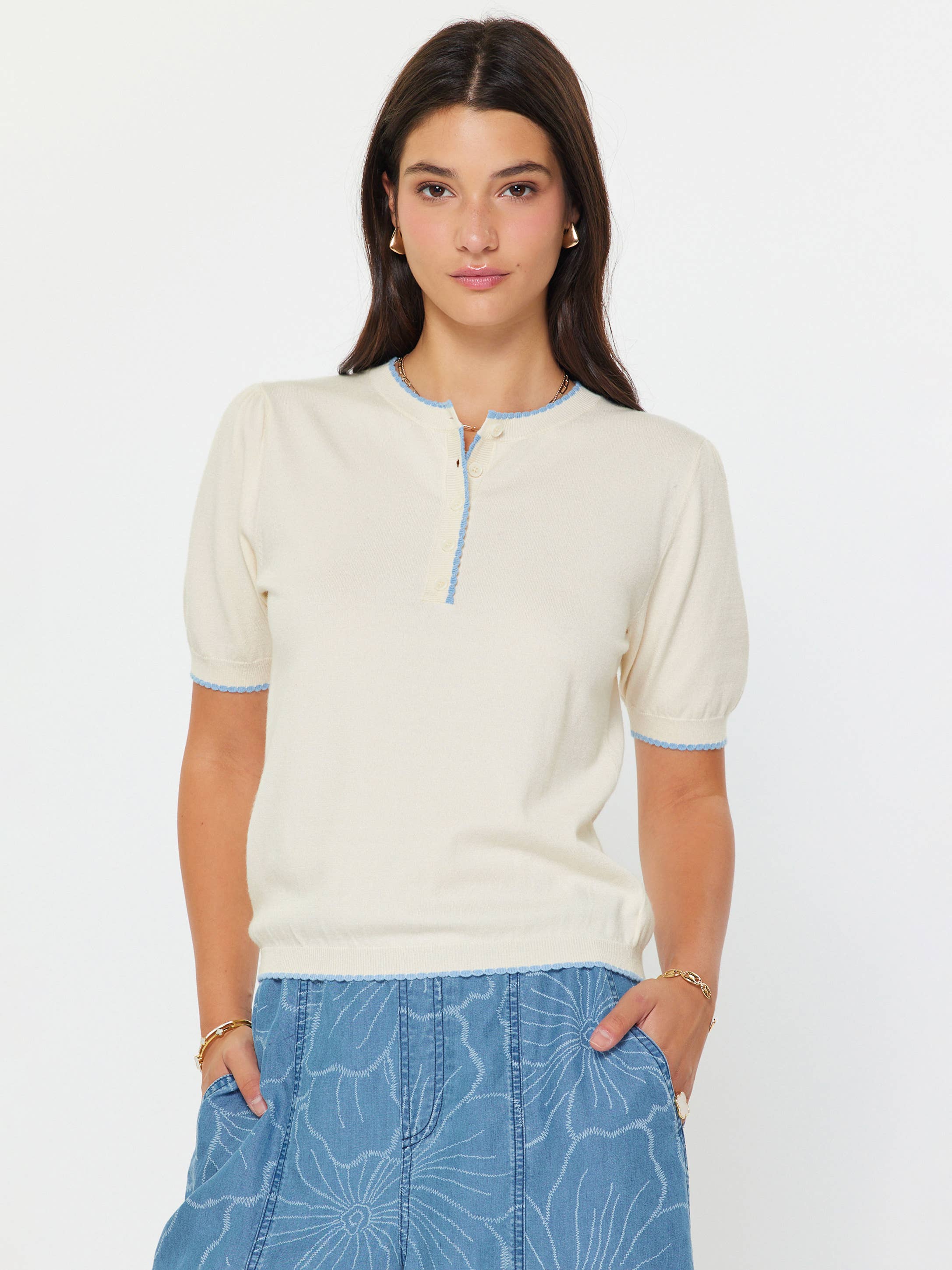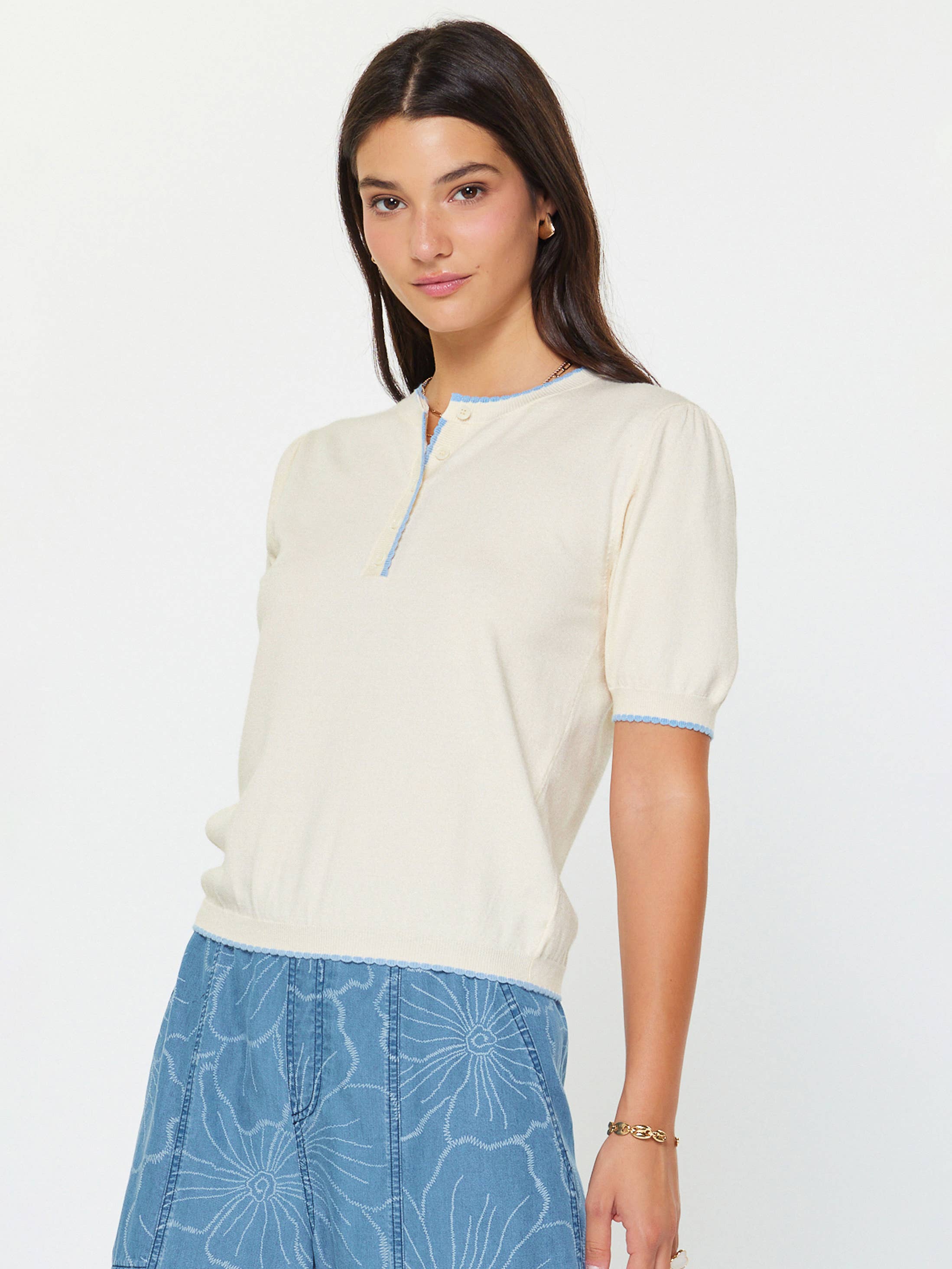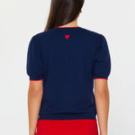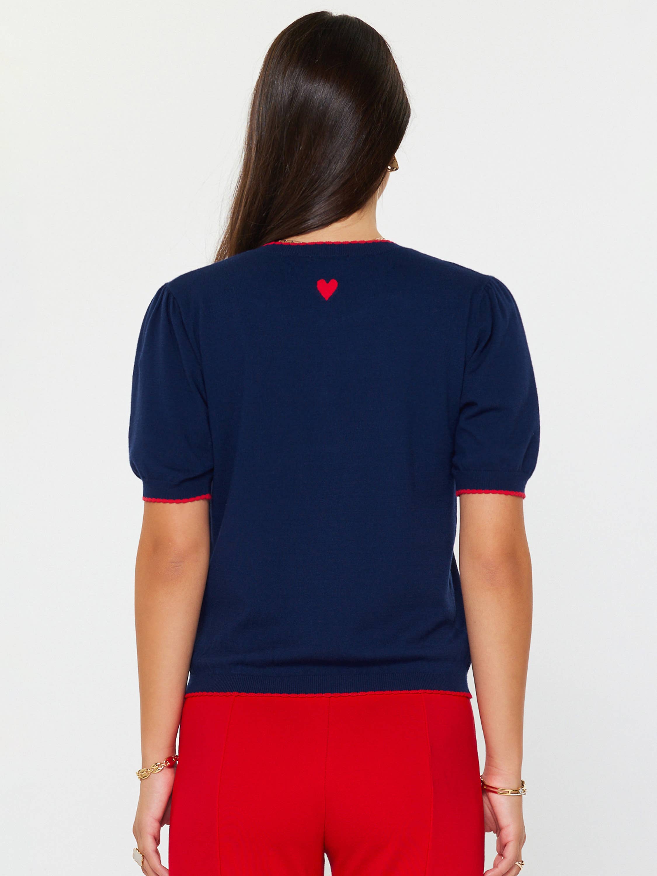 -Crew neck with half button placket -Scalloped edge at neck, sleeves, and hem -Short puff sleeves -Heart motif at back -Hand wash cold separately, lay flat to dry