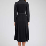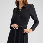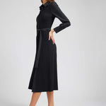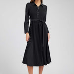A sleek collared midi dress by Current Air, designed with long sleeves, a button-front, and a flattering waist tie.