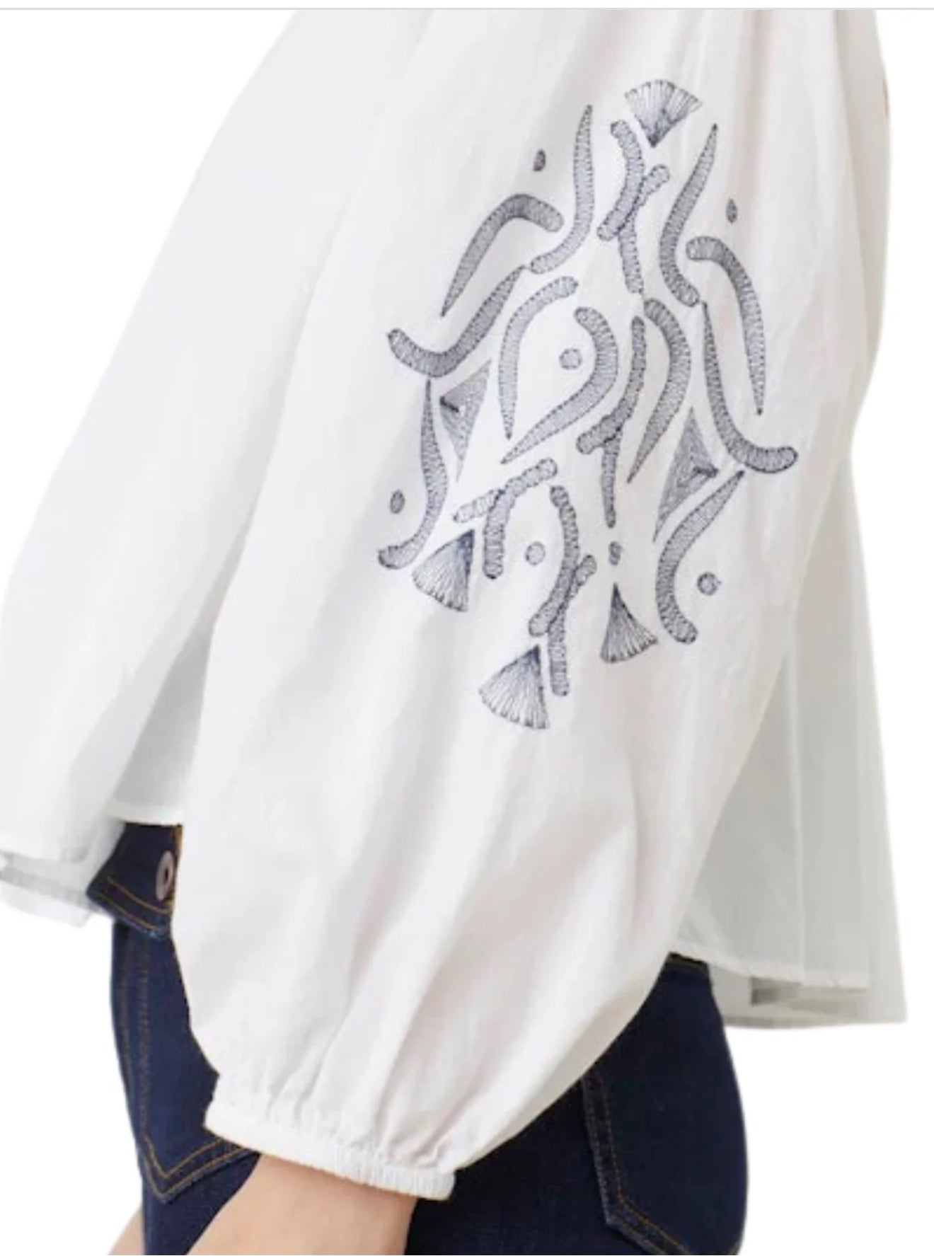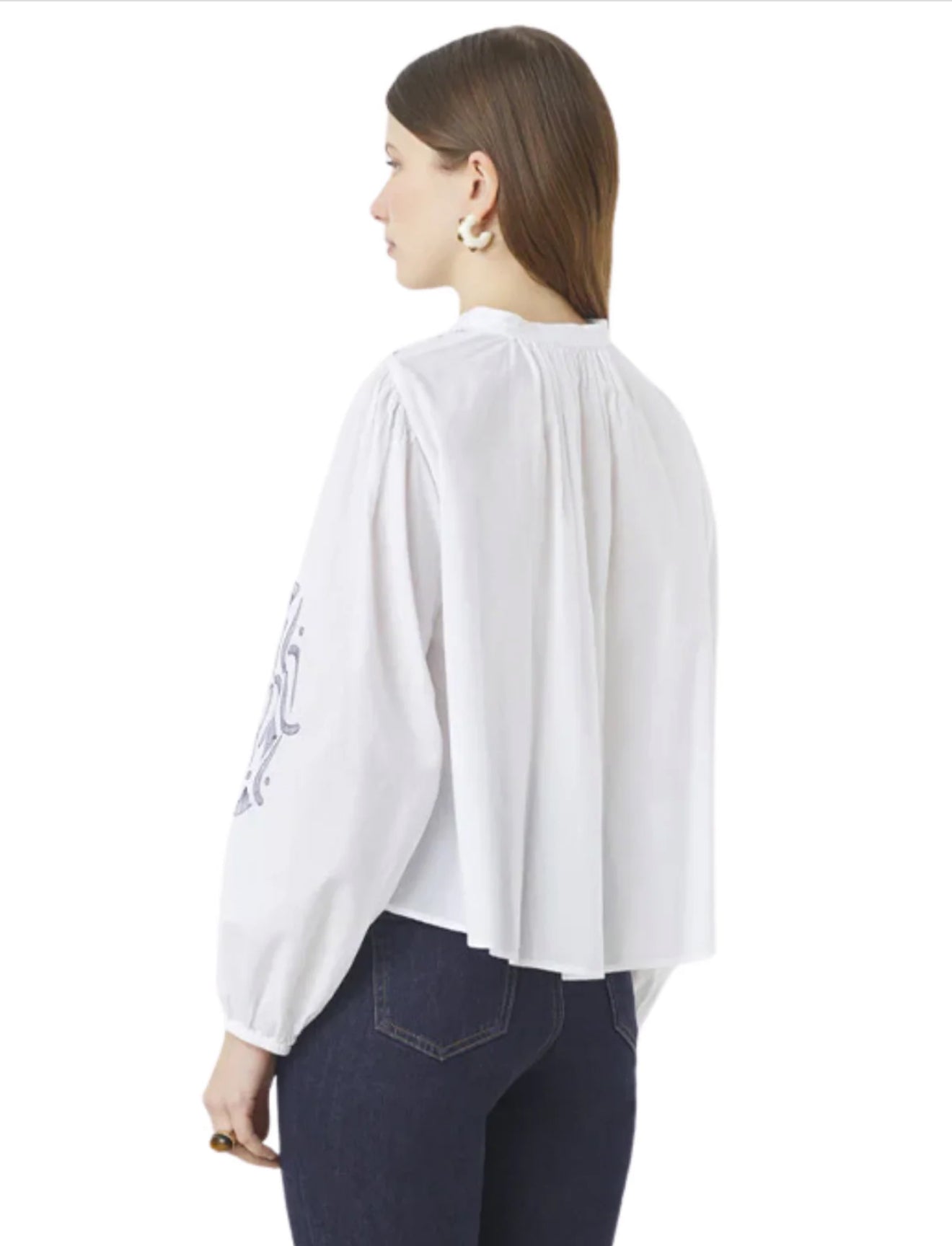 The Livio Blouse by Suncoo features delicate embroidery and soft gathers for a feminine, bohemian touch.