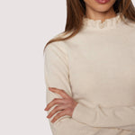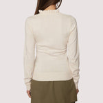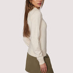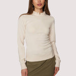 The Elena Mock Neck Top in ivory by Lost + Wander is a soft wool-blend knit with a sleek, feminine fit. Perfect for layering or wearing on its own.