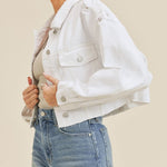 Scissor cut him denim jacket with sleeve, distressing and white wash denim