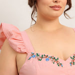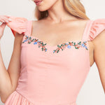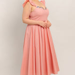 A solid woven midi dress featuring sweetheart neckline, short ruffle sleeve, embroidered front, basque waist, full skirt and smocked back bodice