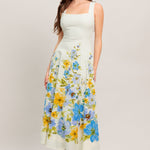 A printed woven midi dress featuring square neckline, sleeveless, circle skirt and back zipper closure