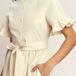 A solid woven midi dress featuring high ruffle neckline, short sleeve with ruffled edge, front button down, self sash tie and tiered skirt