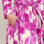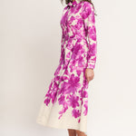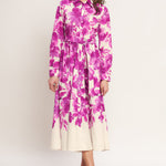 A printed woven midi shirt dress featuring long sleeve, self belt, front button down and full skirt
