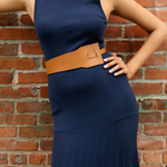 The Trelew – Wrap Belt features a wide, adjustable cut and a soft tapered finish. Whether layered over a blazer or styled with a dress, it wraps smoothly around the waist for a sleek, flattering effect.