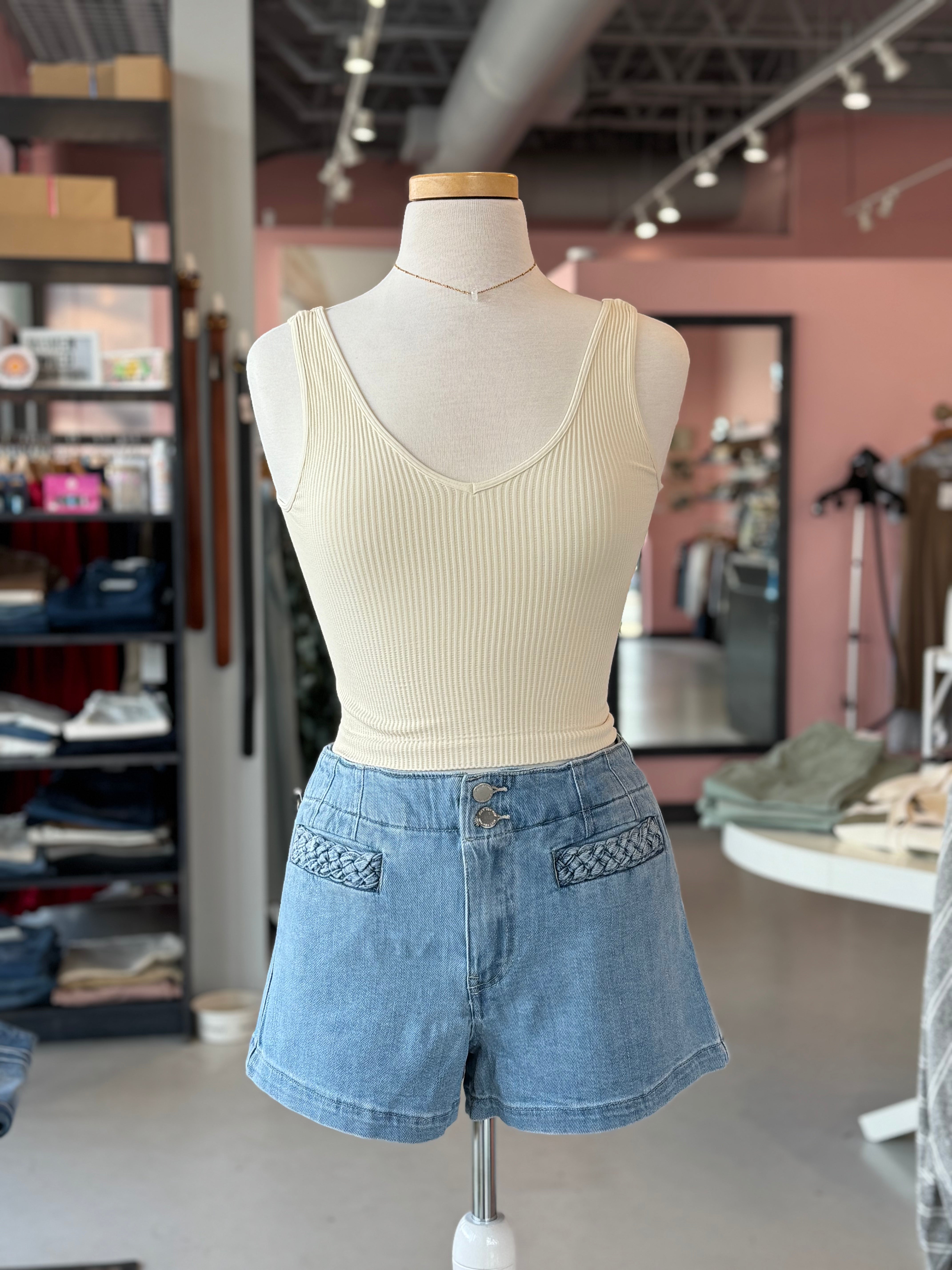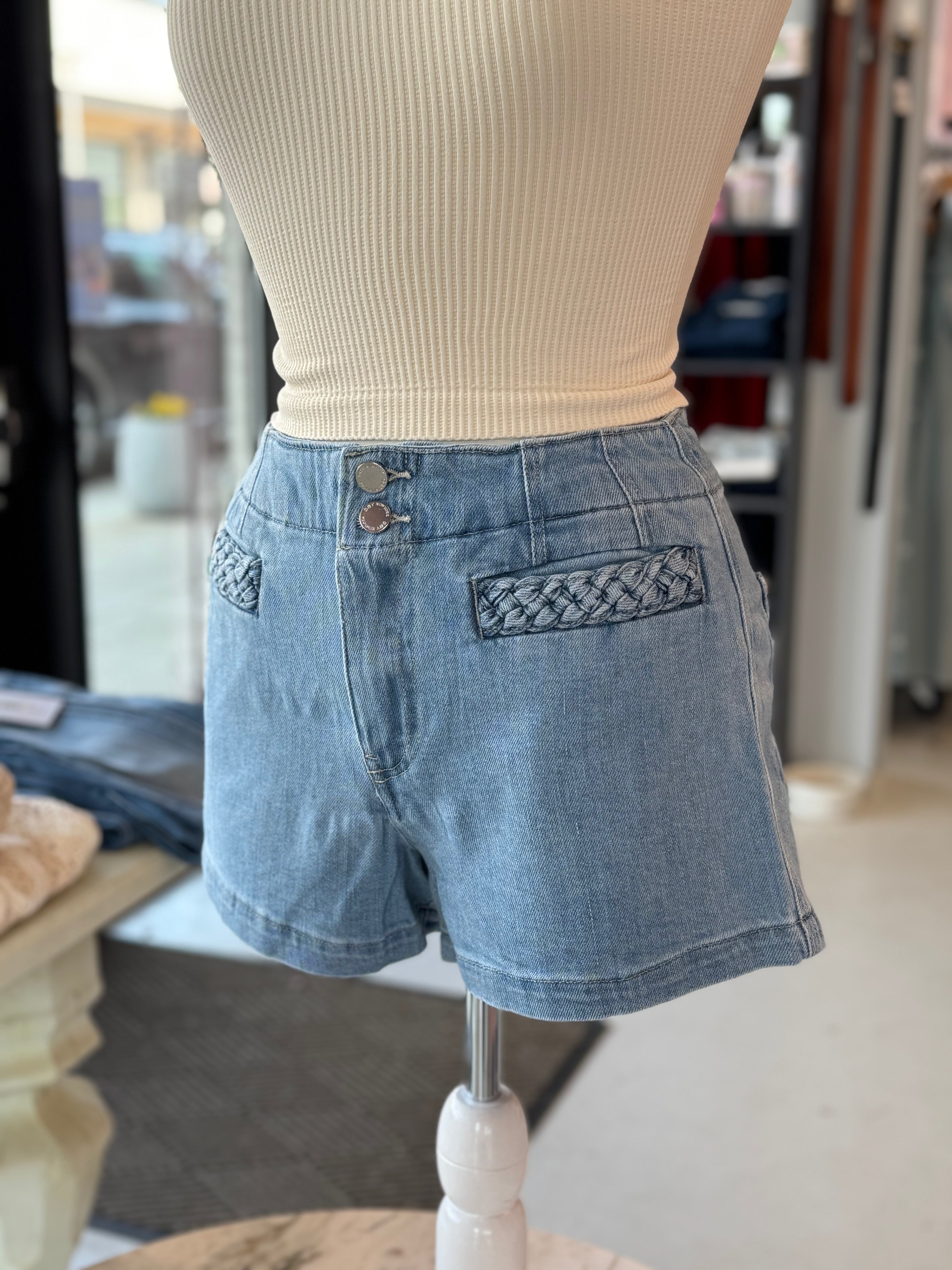 Lovervet by VERVET - HIGH RISE PATCHED BUTTON FLY SHORTS