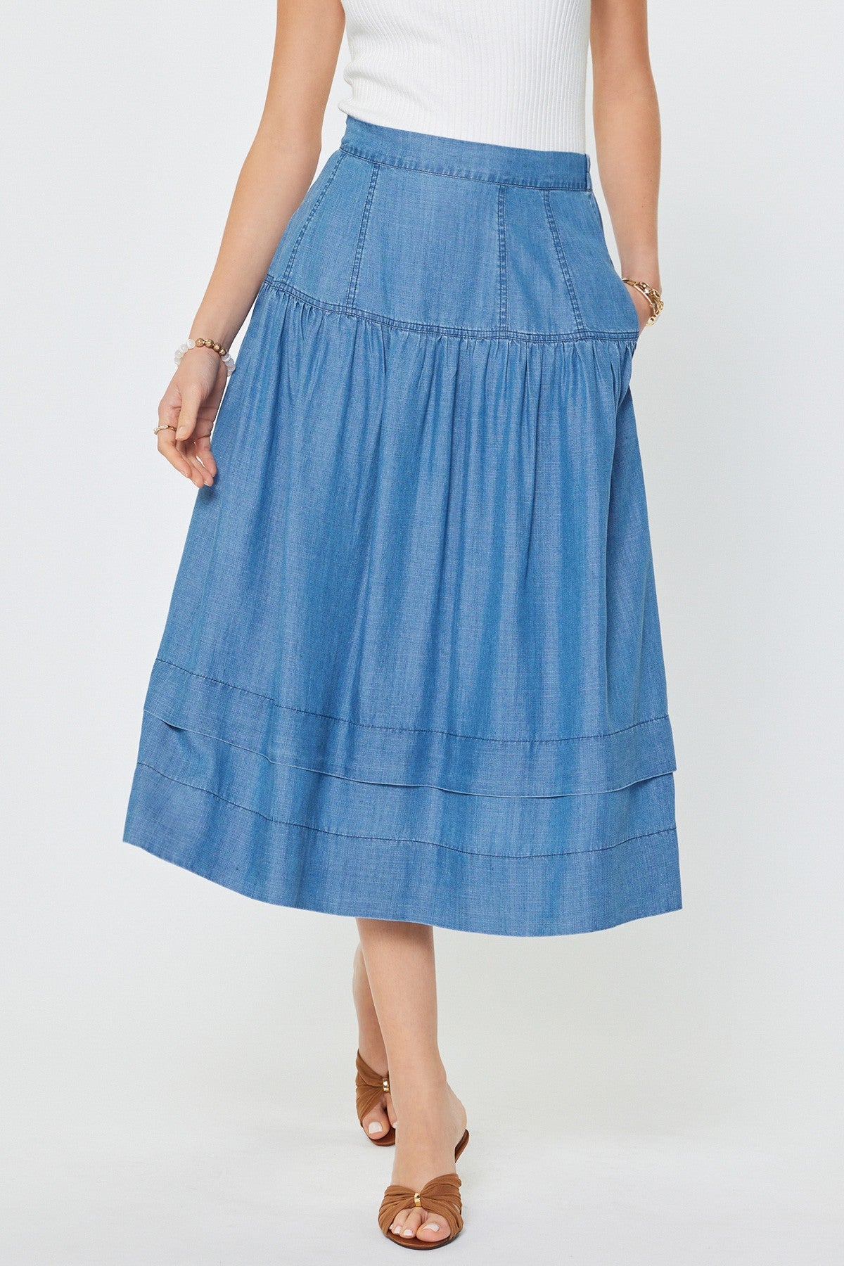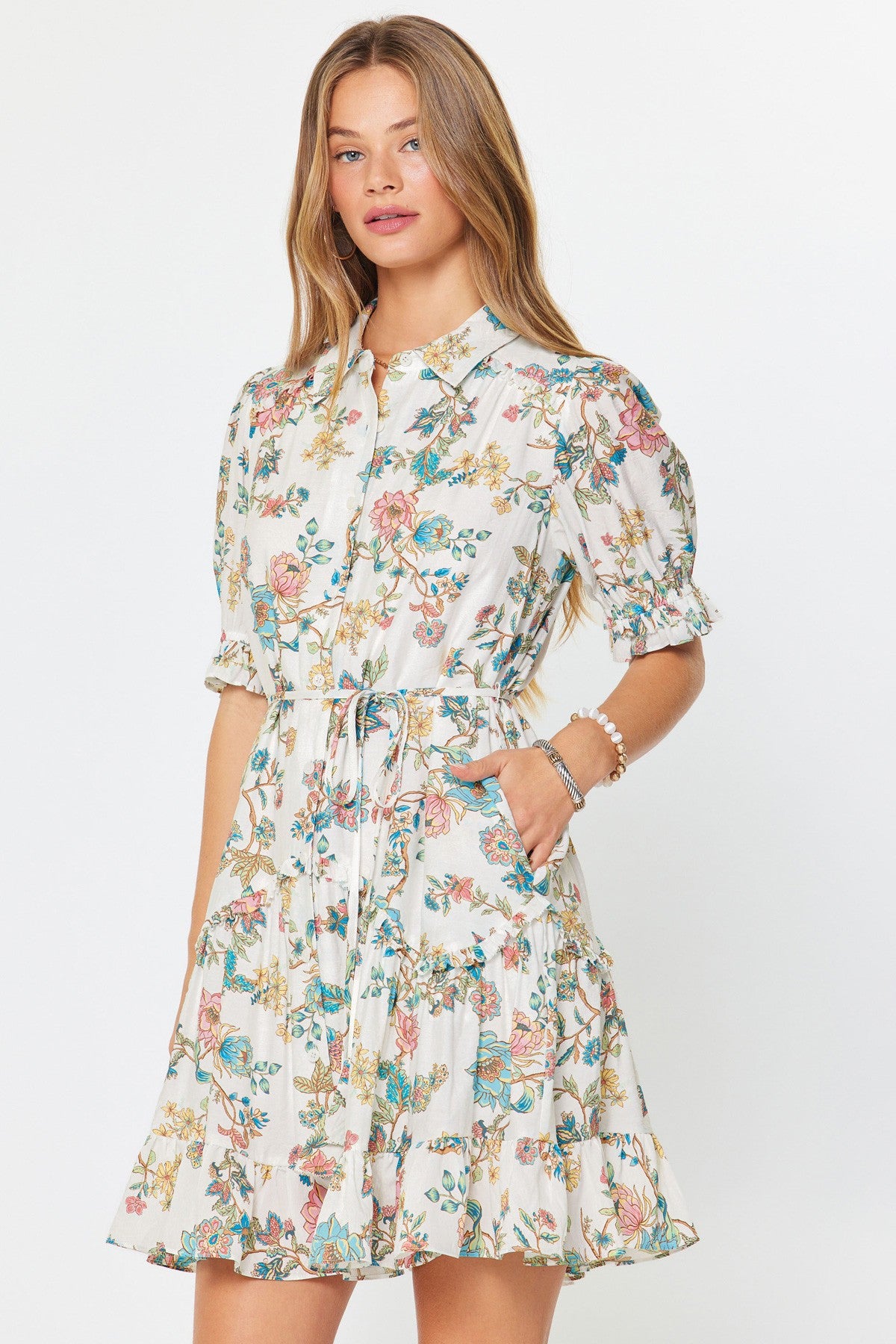 She + Sky Printed Notched Woven Tiered Pintuck Maxi Dress with Side Pockets (online only)