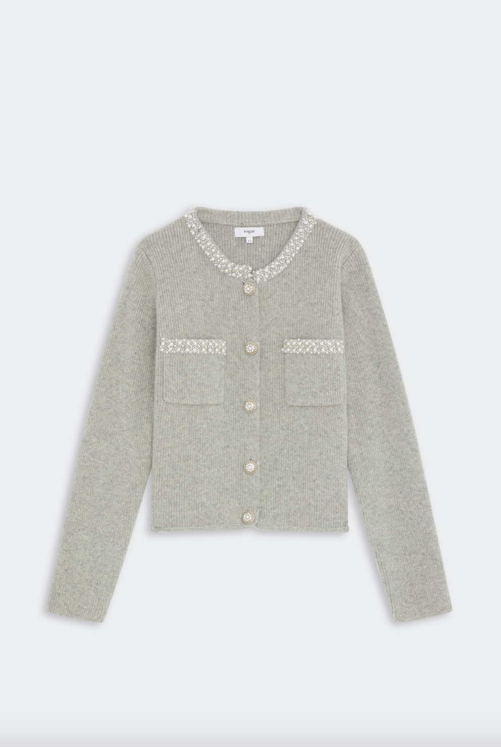 The Garvi Cardigan by Suncoo is a timeless knit with chic contrast trim and front pockets for an elevated everyday look.