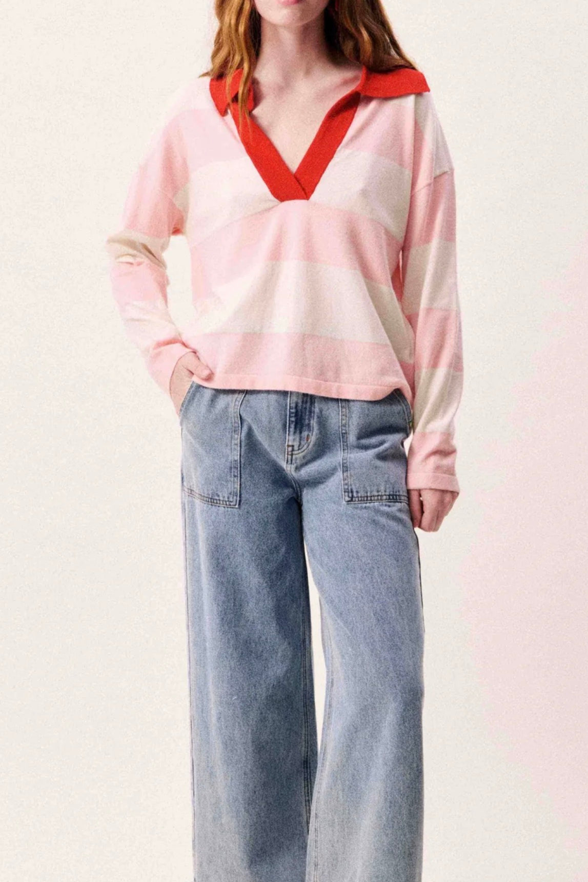 By Together -Knit Sweater Striped Collar V-Neck Long Sleeve Top
