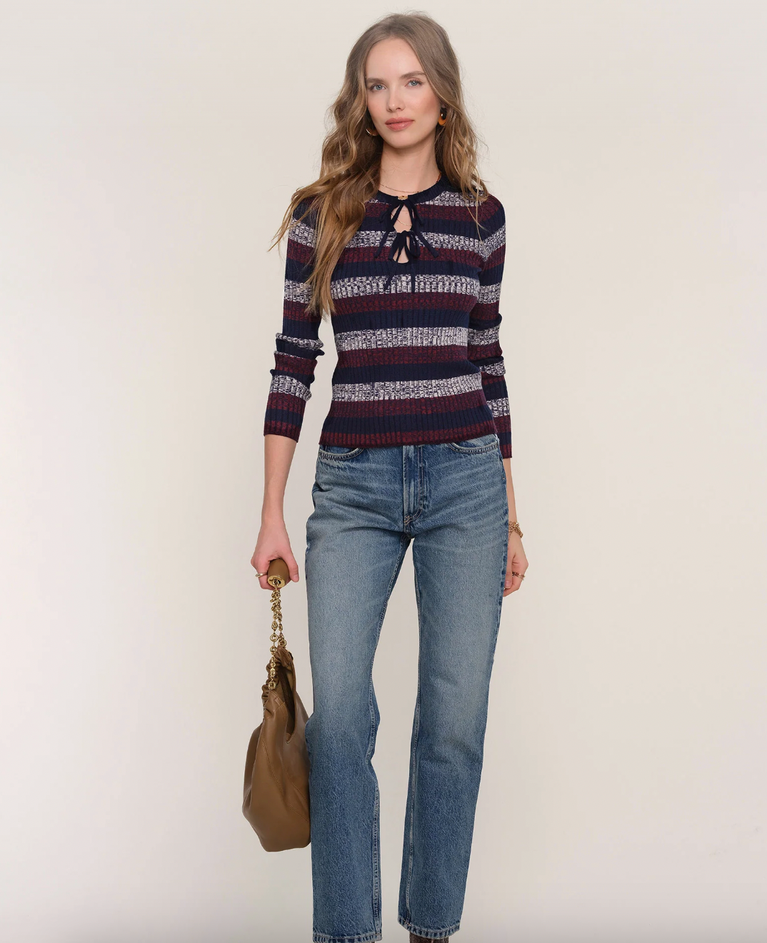 Davi & Dani High-Low Side Slit Striped Johnny Collar Sweater