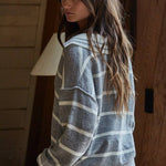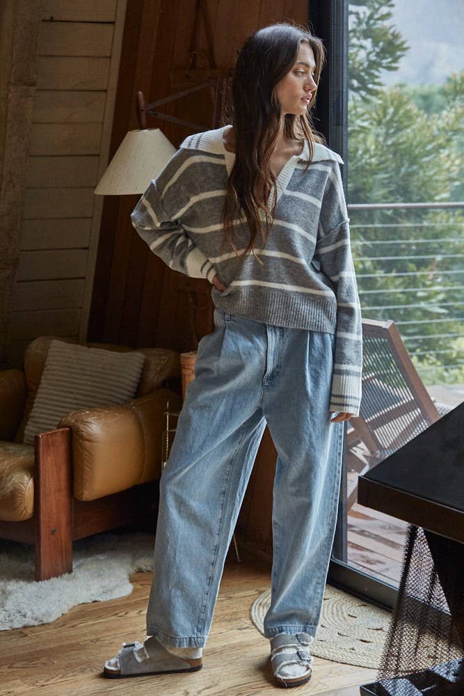 By Together -Knit Sweater Striped Collar V-Neck Long Sleeve Top