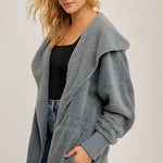 Faux fur, plush hooded jacket with an open front and pockets above hem.