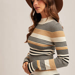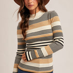 Soft ribbed knit with modern black & mustard stripes. Soft, stretchy knit and a flattering ribbed fit make it perfect for layering or wearing on its own. A versatile piece for casual or work-ready outfits.