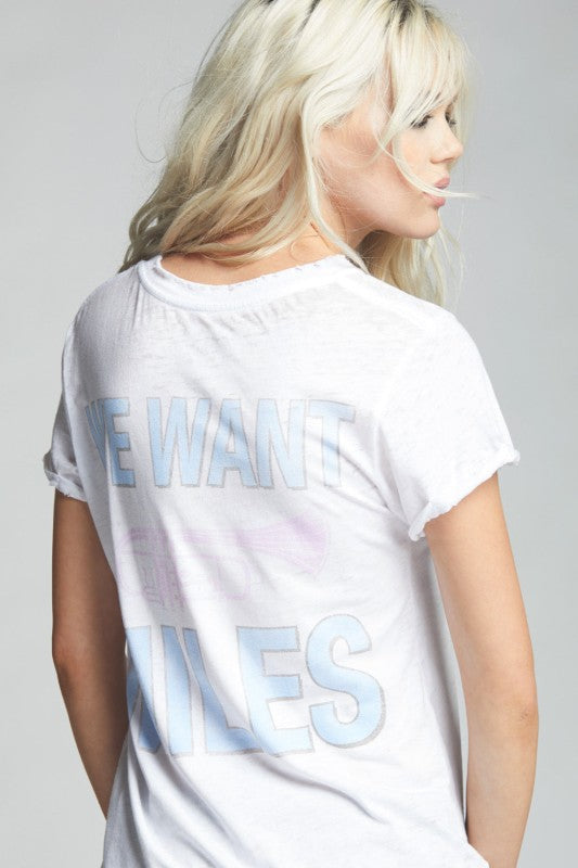 Keep it classy and show your versatile taste in music. Featured is a graphic of the legendary Miles Dewey Davis playing his trumpet with \"We Want Miles\" verbiage on the front and back. Made from vintage washed fabric, rolled short sleeves, a ribbed crew neck, distressed hems, and a fitted silhouette.