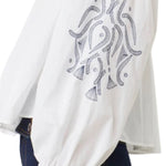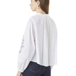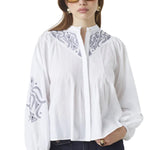 The Livio Blouse by Suncoo features delicate embroidery and soft gathers for a feminine, bohemian touch.