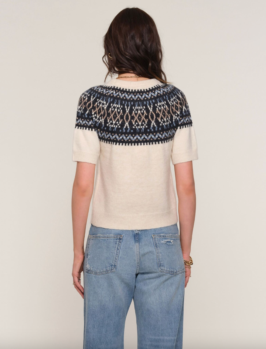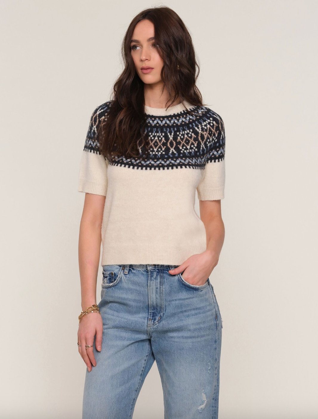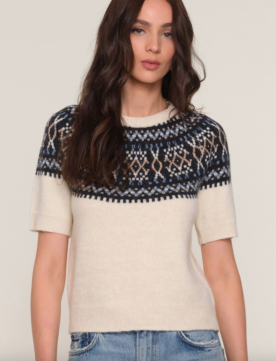The Ellery Sweater is a simple, crew neck top. It's made from a soft meange knit and features a fair isle pattern around the neck and sleeves.