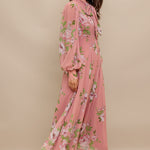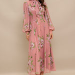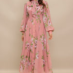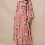 A printed woven midi dress featuring high neckline with bow tie, short puff sleeve with cuff, front button down and circle skirt
