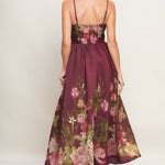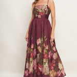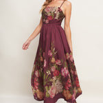 A printed woven ankle dress featuring straight neckline, straps, full skirt and back zipper closure