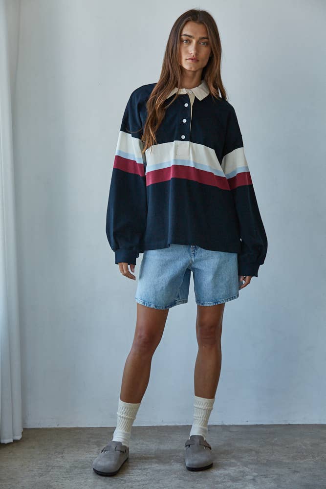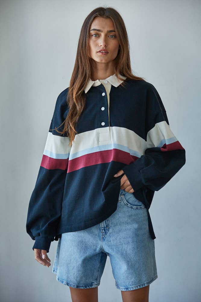 Knit Cotton Printed Striped Jersey Collar Neck 4 Button Up Long Sleeve Pullover Top With Side Slits