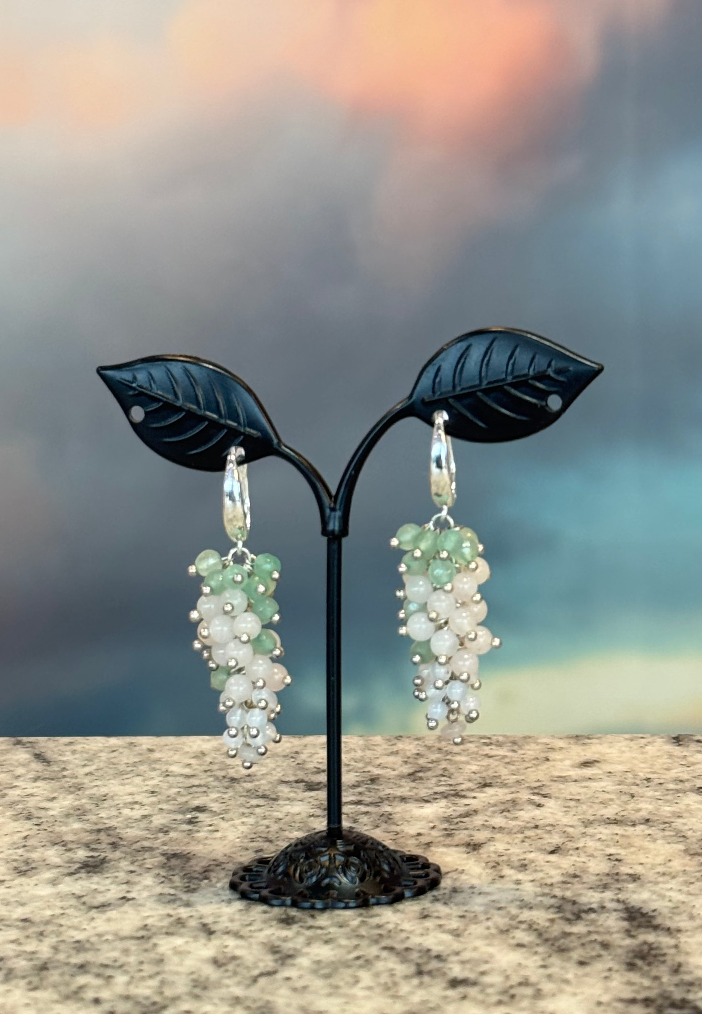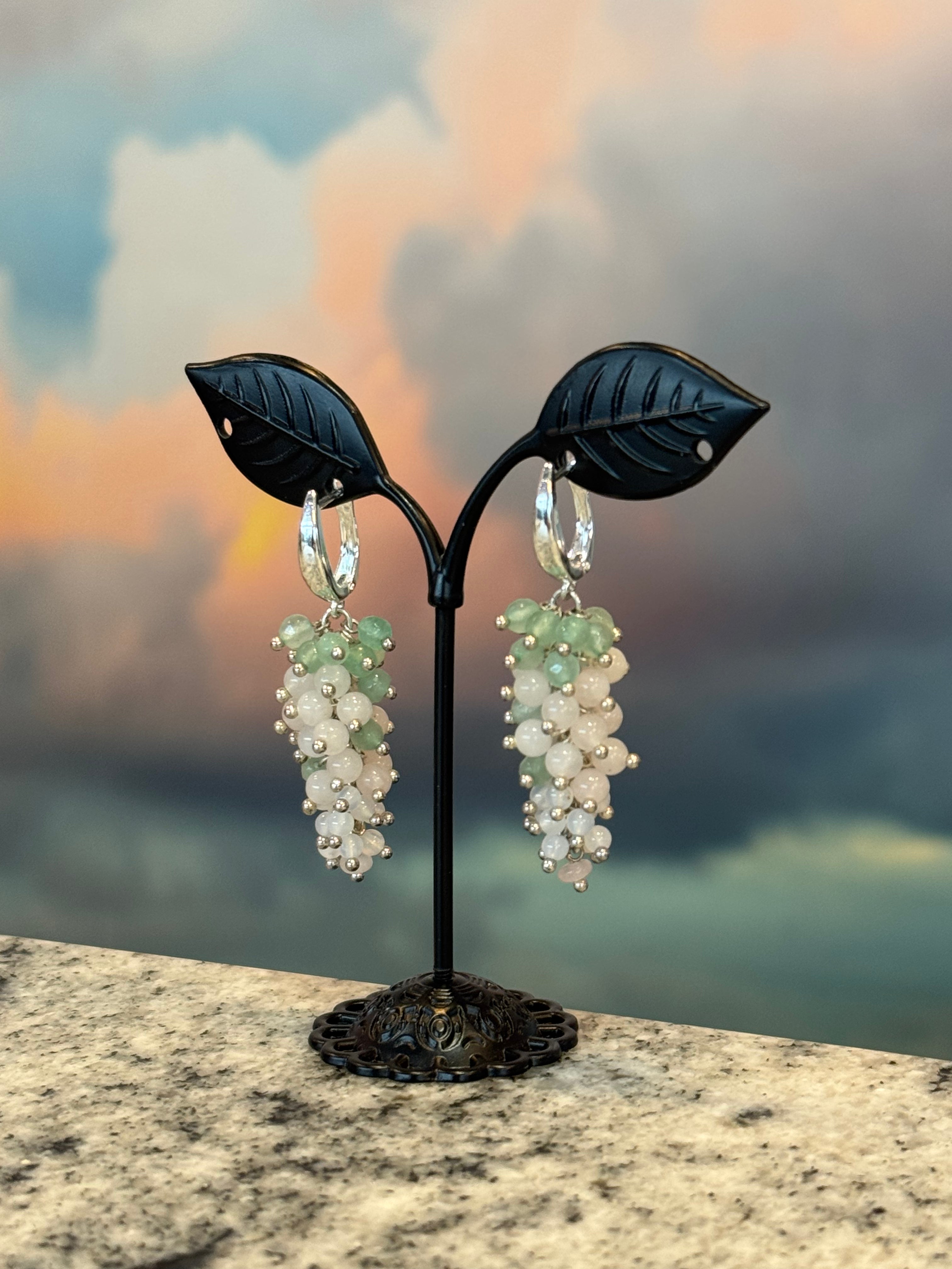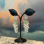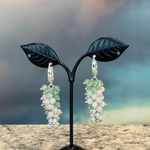 Handmade soft green and white gemstone cluster drop earrings. Lightweight, eye-catching, and nature-inspired touch to any outfit.